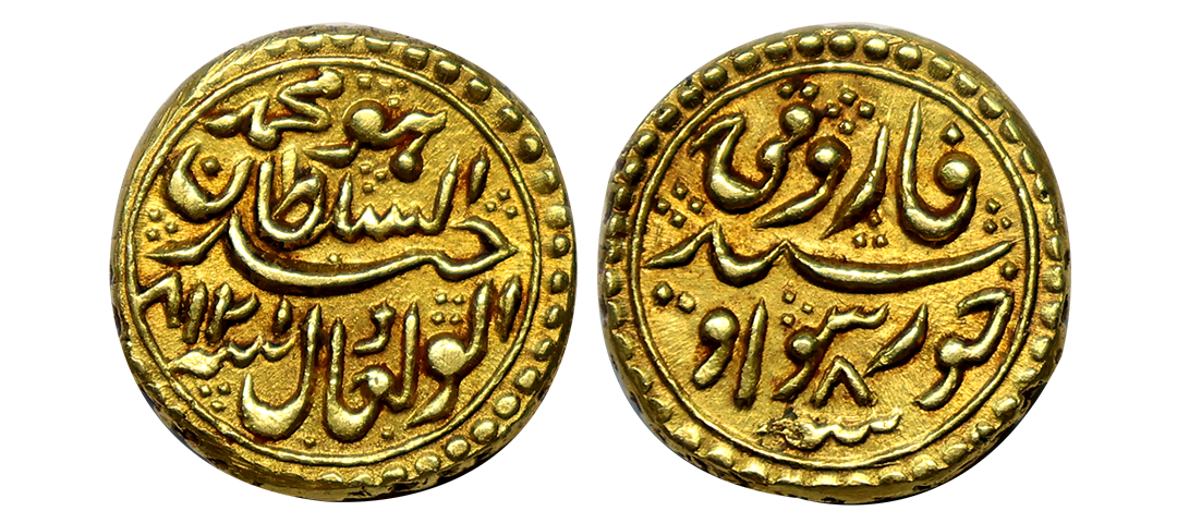 Mysore Tipu Sultan (AM 1215-1227, 1787-1799 AD), Gold Pagoda, 3.41 gms, Khurshed Sawad (Dharwar) Mint, AM 1218, RY 8, Obv: hu sultan ul-waheed al adil & Muhammad at the top, Rev: faruqi, Khurshed Sawad Mint & sana 7, KM # 99a, about extremely fine, very rare.