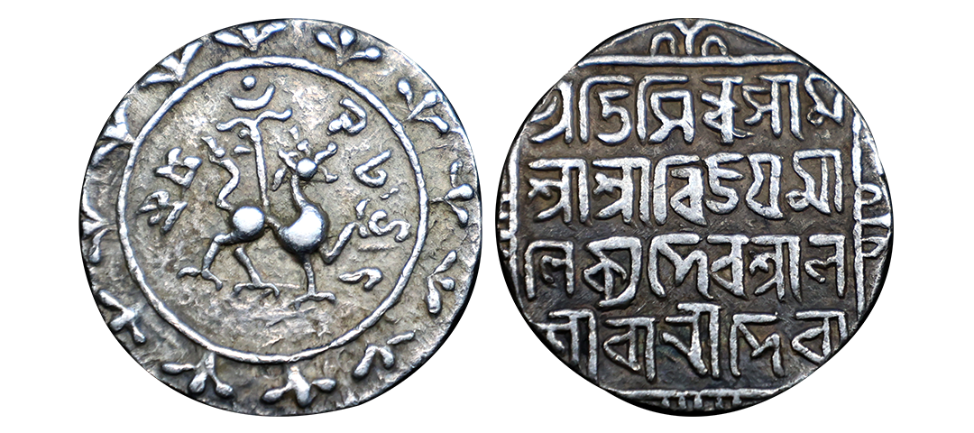 Vijaya Manikya, Silver Tanka, 10.63g, Saka 1479, citing Queen Lakshmi Pratisindhu Sim Type,, obv. lion to right, standard, crescent and bead above, bead by lion's mouth, date below, all within circle and ornamental border, rev. in four lines: Pratisindhu Sim/ Sri Sri; Vijaya/ Manikya Deva La/kshmi Rani Devya in square and ornamental border (R&B 113). Extremely Fine, Scarce.