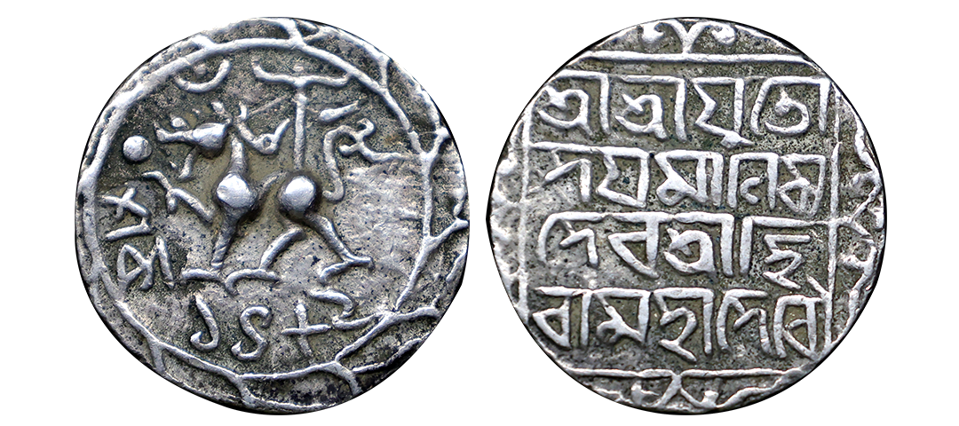 Udaya Manikya (SE 1489-1495; 1567-1573 AD), Silver Tanka, 10.57g, Saka 1489, citing Queen Hira, obv. lion facing left, crescent and dot above lion. Pellet by lion's month. Arches point left. rev. Sri Sri Yuto/ daya Manikya/ Deva Sri Hi/ ra Maha Devyau within square with ornamental border, (R&B 142). This varity is scares. Very Fine+, Rare.