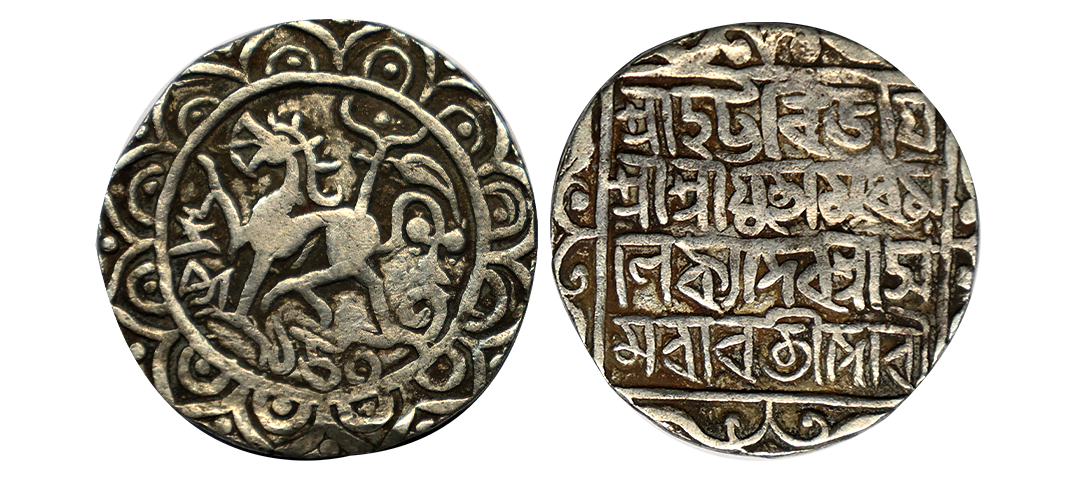 Tripura, Amara Manikya (SE 1499-1508/1577-1586 AD), Citing Queen Amaravati, Silver Tanka, 10.66 gms, Saka 1502, Obv. Lion facing left & date below within a circle bordered by a series of double arches, Rev. Digbijayi Sri Sri/ Yutamara Mani/kya Deva Sri Ama/ravati Devyau, KM # 91, RB #162, very fine+, very rare.