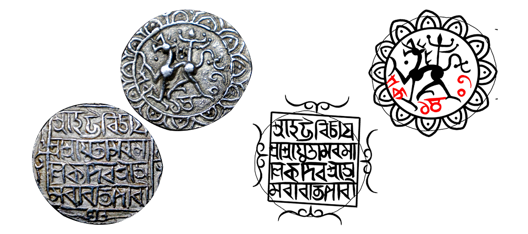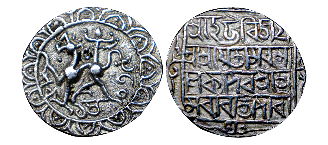 Tripura, Amara Manikya, Silver Tanka, 10.69g, with title Srihatte Vijayi, citing queen Queen Amarivati obv. lion facing left, standard above, date SE 1503 below, pellets added below lion's head, rev. Srihatte Vijayi/ Sri Sri Yutamara Ma/nikya Deva Sri A/marivati Devyau (Bose- Rhodes 171). Very Fine, Rare.
