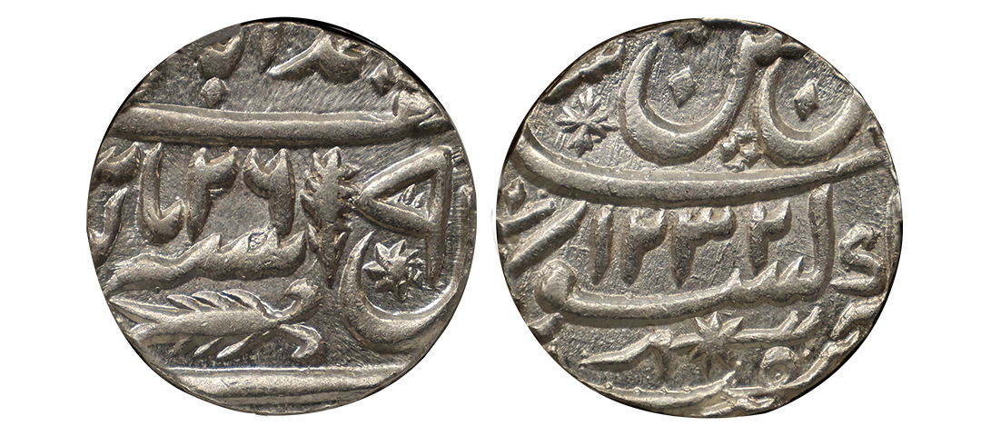 Awadh, Muhamadabad Banaras, Silver Rupee, AH 1232/26 RY, "Saya-e-Fazle elah" Couplet. In the name of Shah Alam II, Obv: Persian legend "sikka zad haft kishwar saya-e-fazle elah, Hami din-e-Muhammad Shah Alam Badshah", star, date, Rev: Persian legend "sana 26 julus" & "zarb Muhammadabad Banaras", mint mark flag and star, fish, (KM# 103.2), nice luster, superb quality graded by NGC as MS 63, Rare.