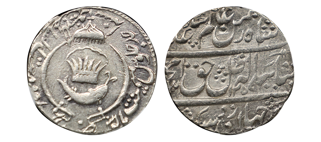 Awadh, Amjad Ali Shah (AH 1258-1263/1842-1847 AD), Mulk Awadh Bait-us-Sultanat Lakhnau Mint, Silver Rupee, AH 1259/Ahad RY, "Ba tayeed-e-ilah" Couplet, Obv: Persian legend "dar jahan zad sikka -e-Shahi ba taeed elah, zille haque Amjad Ali Shah-i-zaman Alam Panah" with Hijri year 1259, Rev: Persian legend "zarb mulk Awadh Bait us Sultanat Lakhnau, sana Ahad julus maimanat manus" in the margin & Parasol above crown & fish, flanked by curved swords, (KM #336/MK # 10.02), superb strike, centrally struck, lovely toning, graded by NGC as MS 62, Very Rare in this grade..
