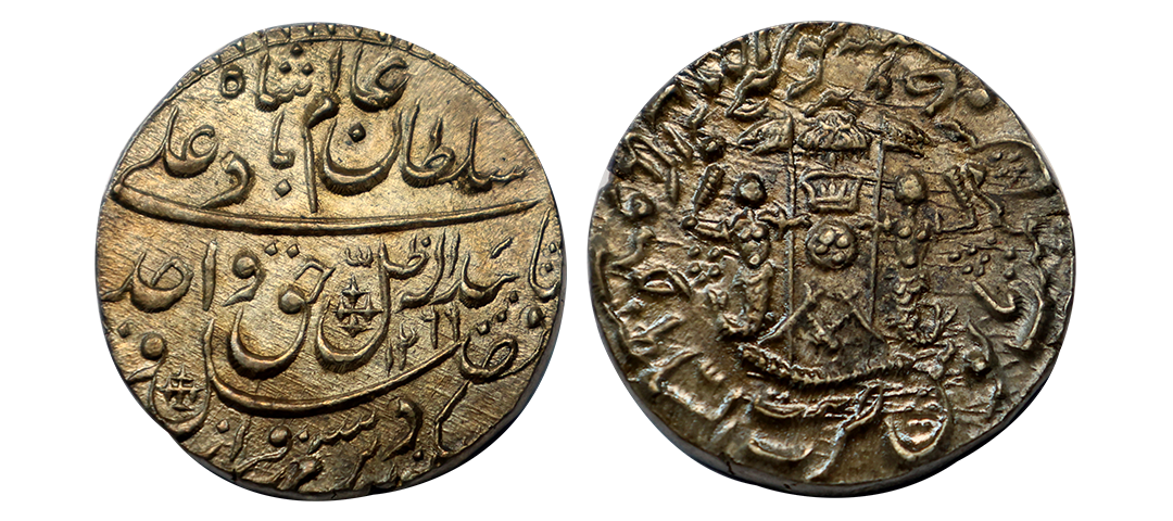 Awadh State, Wajid Ali Shah (AH 1263-1272, 1847-1856 AD), Silver Rupee, 11.14 gms, Bait-us-Sultanat Lakhnau Mulk Awadh Akhtarnagar Mint, AH 1269, RY 6, Obv. zarb bait-us-sultanat lakhnau mulk awadh akhtarnagar sanah julus maimanat manus, Rev. sikka zad bar seem wa-zad az-fazl tayeed-i-ilah zille haque wajid ali sultan alam badshah, KM # 365.3, Kapoor & Master Ref #10.48, Uncirculated, rare.
