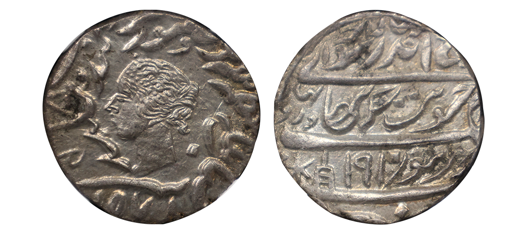 Bharatpur State, Jaswant Singh (AH 1269-1311/1853-1893 AD/VS 1909-1950), Graded MS62, Brij Indrapur (Bharatpur) Mint, Silver Rupee, VS 1910/1858 AD, With the name of Queen Victoria, Obv: Persian legend "janab malika-e- muazzama malika queen victoria farman rawai hind-o-inglistan" and the bust of the queen, Rev: Persian legend "Jaswant Singh Bahadur, zarb Brij Indrapur Bharatpur" with VS 1910 and a star & katar symbol, (KM# 157), superb quality with luster, sharp and centrally struck, attractive toning, graded by NGC as MS62, Very Rare in this grade.