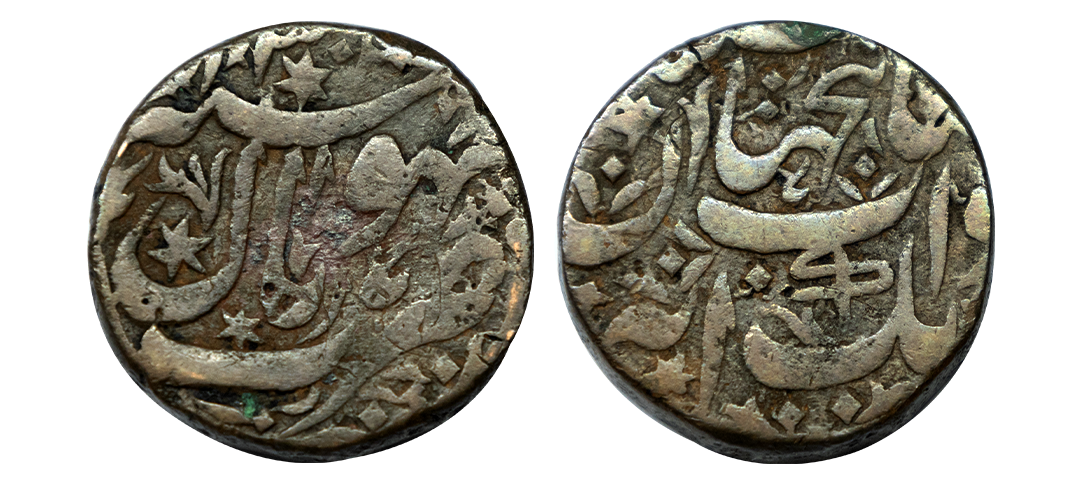 Bhopal State, Dost Muhammad (AH 1120-1139 /1708-1726 AD), Silver Rupee, 11.10 gms, Bhopal Mint, "Saya e-fazle Elah" Couplet, RY 46, In the name of Shah Alam II, Obv: Persian legend "Sikka zad bar haft kishwar Saya-e-fazle Elah, Hami dine- Muhammad, Shah Alam Badshah" Rev: Persian legend "Sana 46 julus" & "zarb Bhopal", KM #C12, very fine, scarce.