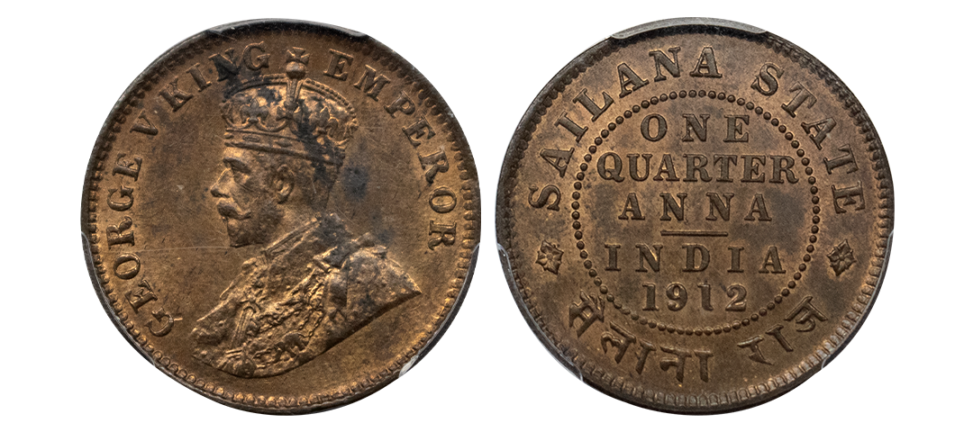 Sailana, Jaswant Singh (1890-1918 AD), Copper ¼ Anna, with the name and portrait of George V, 1912 (KM 16). Graded by PCGS MS64RB, Rare.