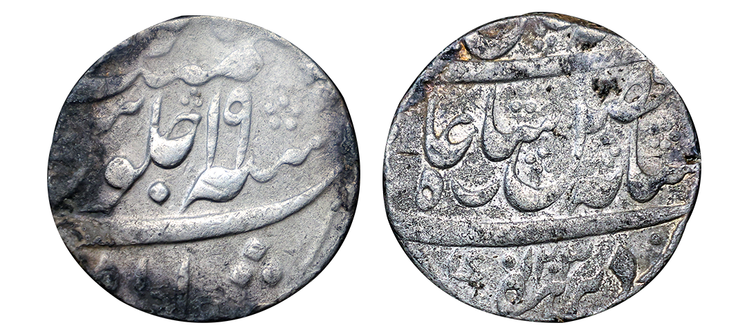 Bengal Presidency, INO Shah Alam II (AH 1174-1221, 1759-1806 AD), Silver Rupee, 11.43 gms, Murshidabad Mint, AH 1202, RY 19, Obv: ‘Sikka zad bar haft Kishwar Saya-e-fazle Elah, Hami dine Muhammad Shah Alam Badshah’, Rev: ‘maimanat manus sana 19 julus zarb murshidabad’, Prid 145, KM 86, very fine, very scarce.