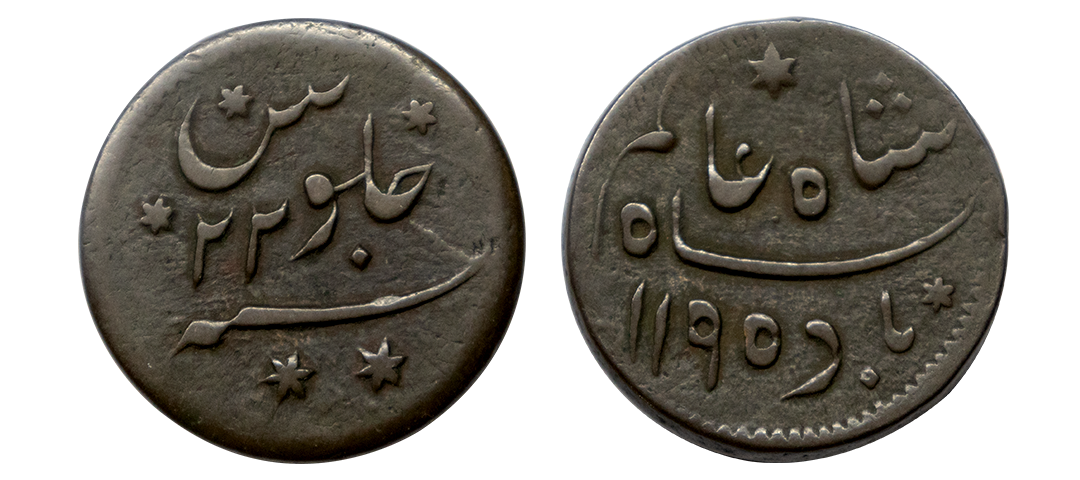 Bengal Presidency, in the name of Shah Alam II (AH 1174-1221, 1759-1806 AD), Copper ½ Anna, 14.65 gms, Prinsep Issue, AH 1195, RY 22, Obv: Persian legend 'Shah Alam Badshah'& Hijri year 1195,Rev: Persian legend "sana 22 julus", KM #126, very fine+, very scarce.