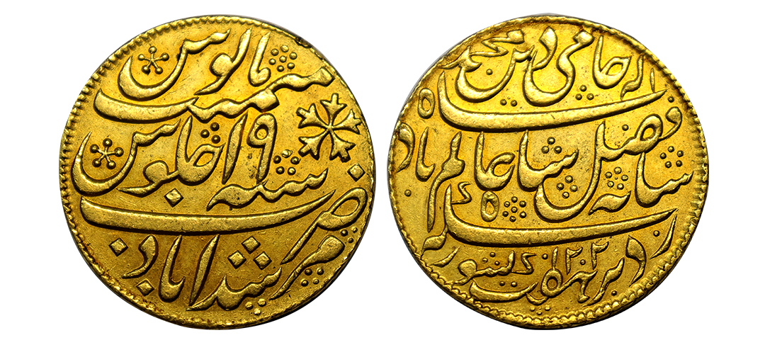 Bengal Presidency, INO Shah Alam II (AH 1174-1221, 1759-1806 AD), Gold Mohur, 12.28 gms, Murshidabad Mint, Dot in Middle Flower Indicating Murshidabad Mint, Rare Type, usually these come with no dot in the flowers, AH 1202, RY 19, Oblique Milling, KM # 103.1, Stevens # 4.3, Prid # 62, About Uncirculated, rare.