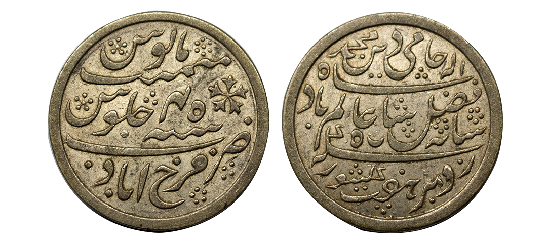 Bengal Presidency, Farukhabad Mint, Silver Rupee, 11.62 gms, RY 45, In the name of Shah Alam II, Obv: Persian legend "sikka zad bar haft kishwar saya-e-fazle elah, Hami din-e-Muhammad, Shah Alam Badshah", Rev: Persian legend "sana 45 julus" "zarb Farukhabad" at the bottom, KM #77, almost uncirculated, scarce.