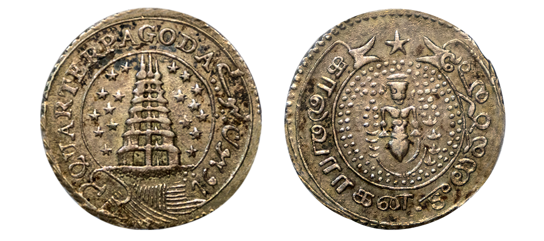 Madras Presidency, Silver ¼ Pagoda, 1818, Obv: a seven-tiered gopuram of a temple, on stony ground, between 9 stars on each side, bordered by a buckled garter containing the value "QUARTER PAGODA" in English and Persian, all within a beaded border partially visible, Rev: a figure of Vishnu usually holding a sword in his left hand and rising from a lotuser, dotted and other symbols on each side within two beaded circles, all within this ribbon containing the value in Tamil and Telugu, graded as AU 55 by PCGS, very rare.