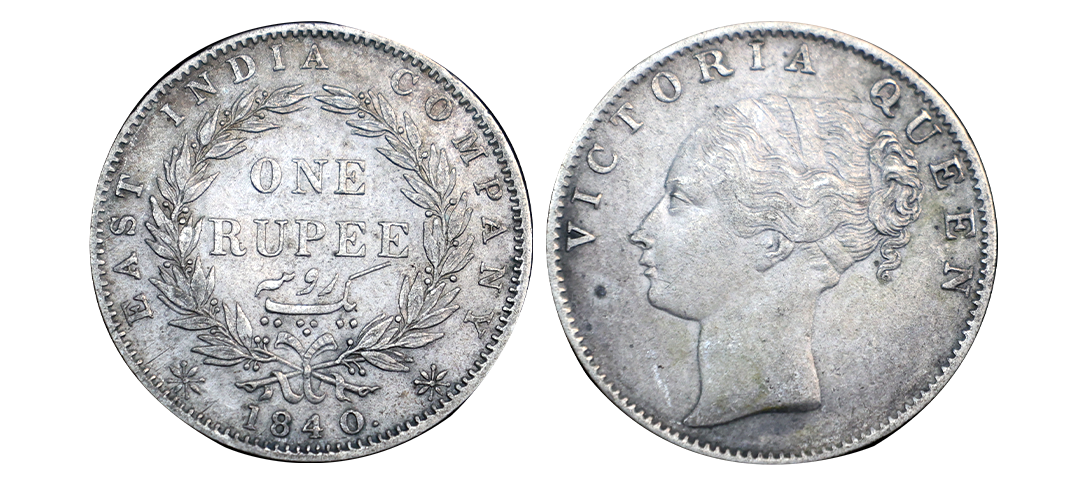 Victoria Queen, continuous legend, silver rupee, 1840, Calcutta mint, modified features, English head, "M" incuse, 34 berries, one berry opposite 'O' of ONE is missing, crescent in relief, unlisted in PR and GK, Extremely Fine.