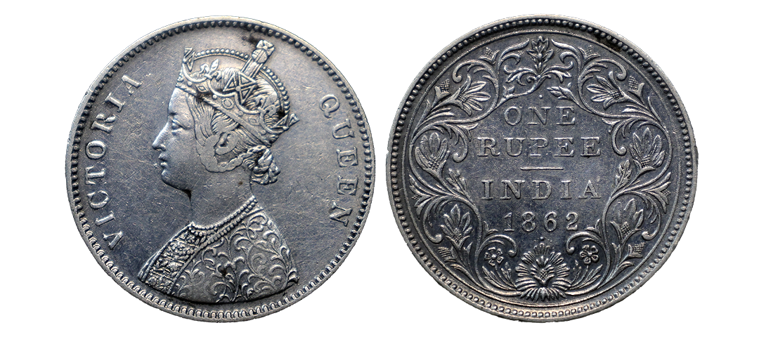 Victoria Queen, Silver Rupee, 1862, 1/8 (1+7) dots, struck on a earlier used dies of 0/10 dots, therefore traces of erased dots can be seen. very rare.