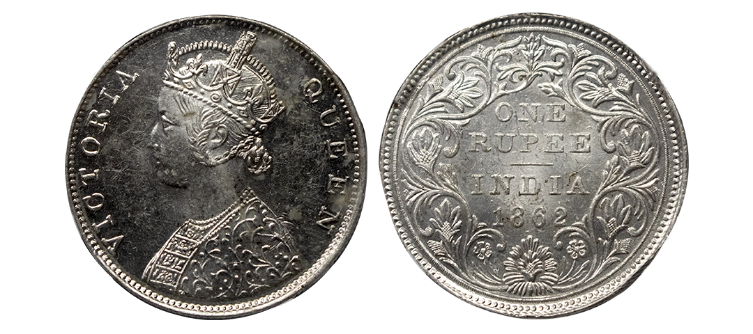 Victoria Queen, silver rupee, 1862, Madras mint, elongated pearls on both arches of the crown, PR 57; S&W 4.56.