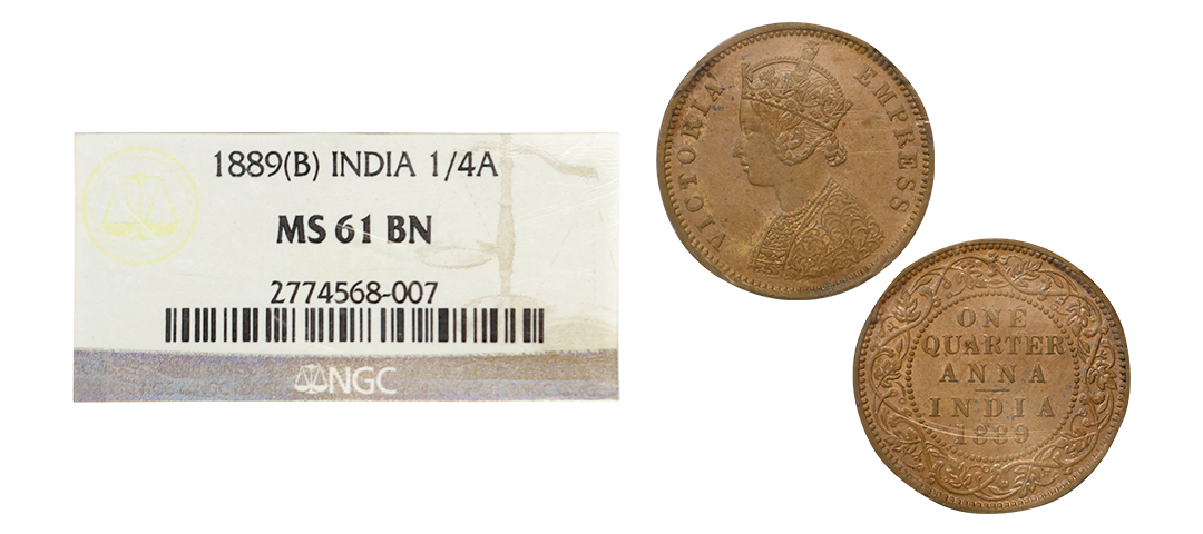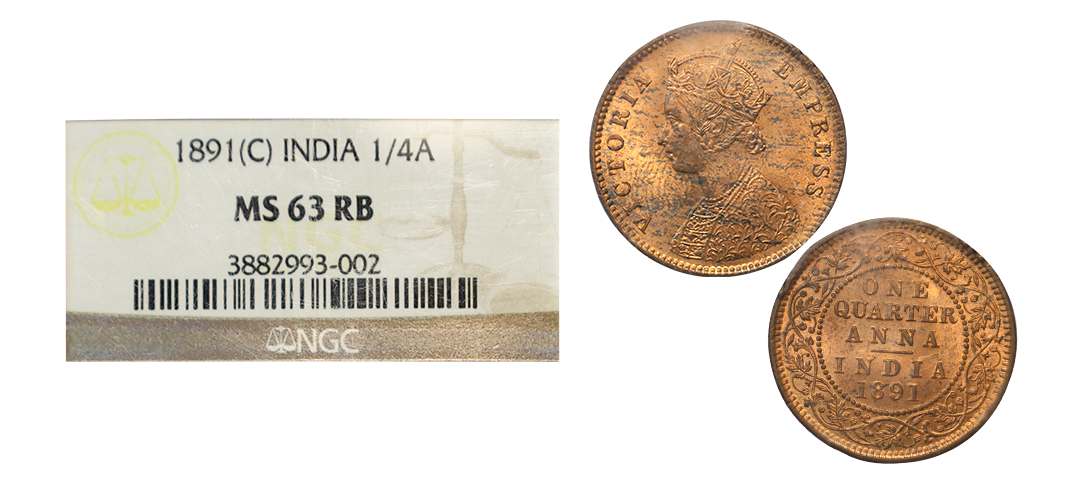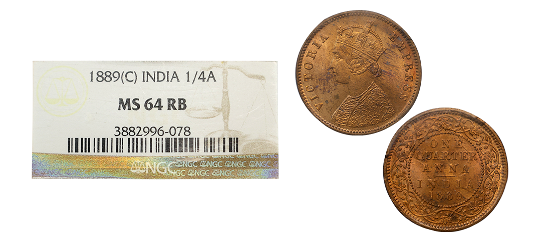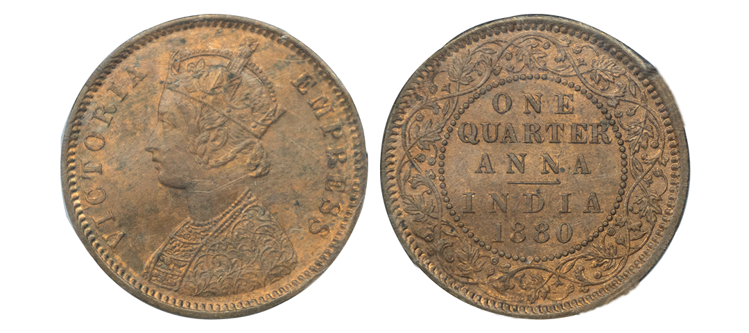 Victoria Empress, copper ¼ anna, 1880, Calcutta mint, B/II/, PR 614; GK 832-833. Graded NGC MS63 RB, Very scarce.