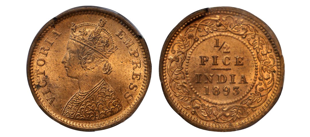 Victoria Empress, Copper, 1/2 Pice, 1893, Calcutta Mint, A/I, No mint mark. F. Prid 726. GK 873. NGC Slabbed MS 63+ RD. Very Rare.