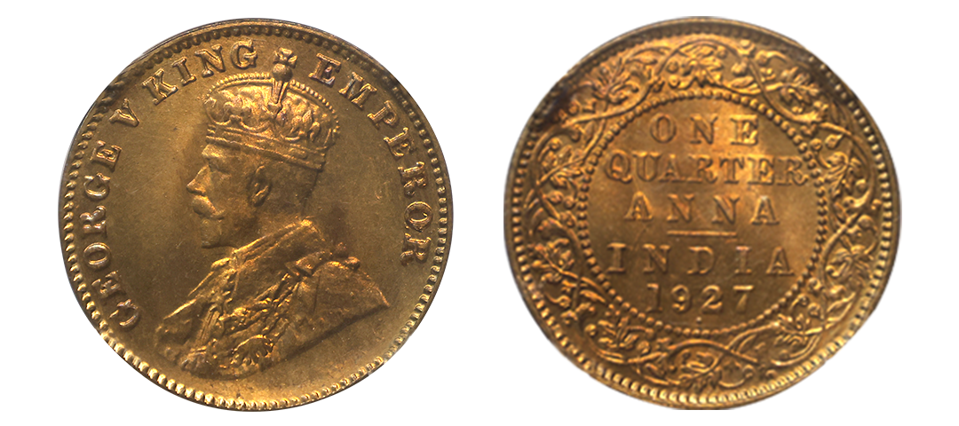George V, Bronze, 1/4 Anna, 1927, Bombay Mint, Dot. F. Prid 680. GK 1185. NGS Slab MS 66 RB. Rare.
