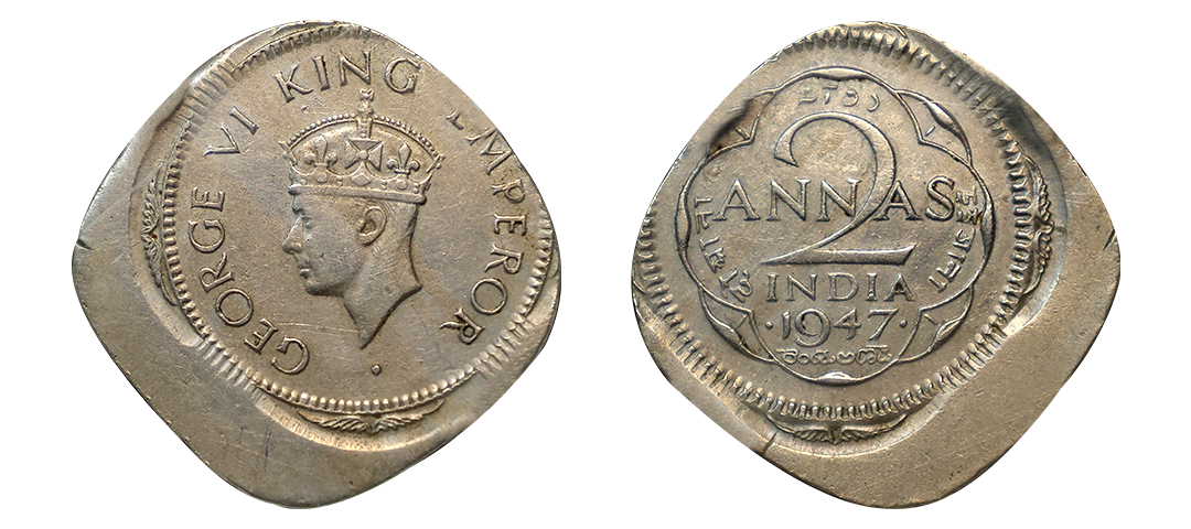 George VI, Cupro-Nickel, 2 Annas, 1947, Bombay Mint, Error XF Details, Scratches Struck 15% off-center on both sides, Graded by NGC.