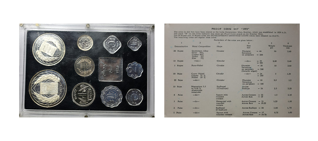 1973, Grow More Food, Proof set of 10 coins, 20 rupees, 10 rupees, 1 rupee, 50 paise, 25 paise, 10 paise, 5 paise, 3 paise, 2 paise and 1 paisa, Bombay mint, RB 35, in original mint packing.