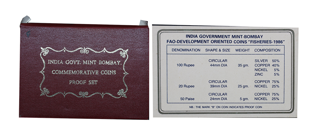 1986 Proof Set, Fisheries, set of 3, 50 Paisa to Rupees 100. In near immaculate condition, within original packaging, Rare. (3); ( from the collection of Mr. I. K. Kejriwal ).