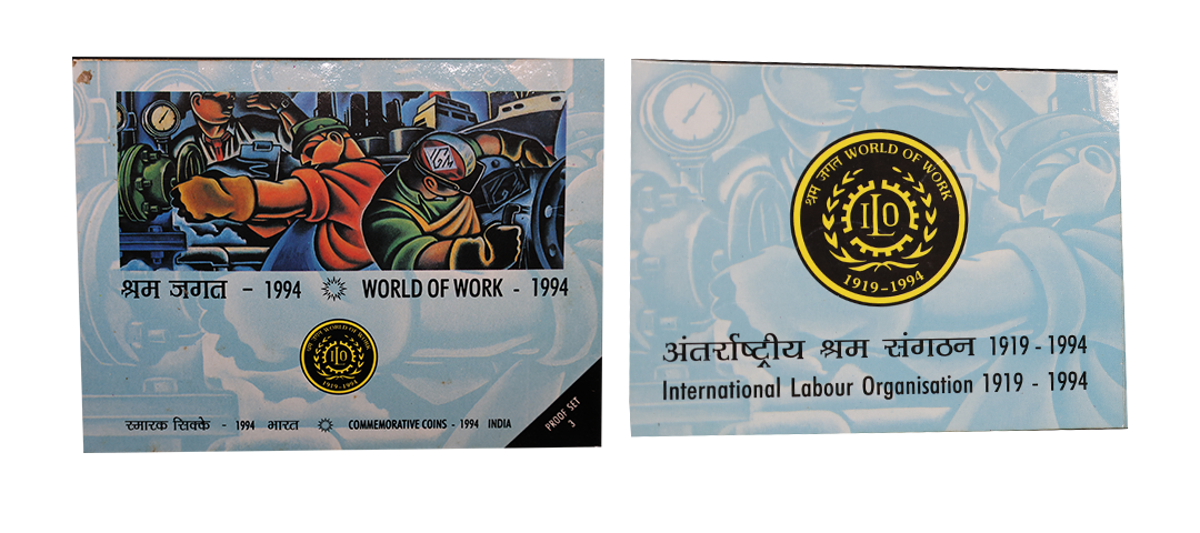 1994 Proof Set, World of work, set of 3, Rupees 5 to 100. In immaculate condition, within original packaging, Rare. (3); ( from the collection of Mr. I. K. Kejriwal ).