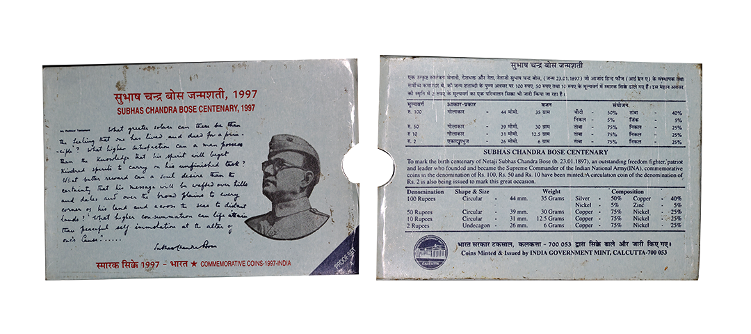 1997 Proof Set, Subhas Chandra Bose Centenary, set of 4, Rupees 2 to 100. In immaculate condition, within original packaging, Rare. (4); ( from the collection of Mr. I. K. Kejriwal ).