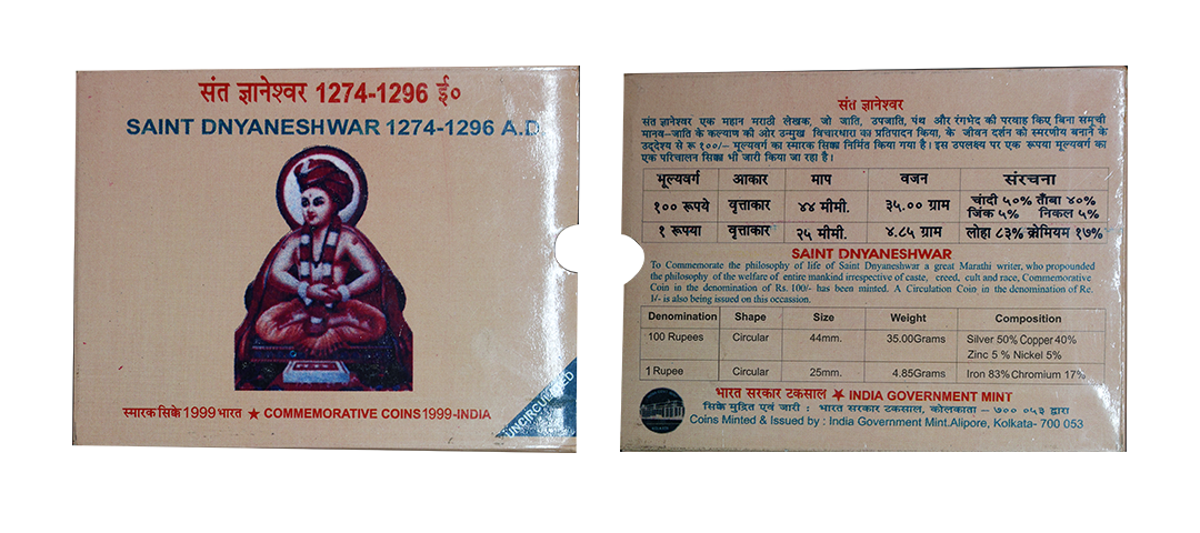 1999 Uncirculated set, Saint Dnyaneshwar, set of 2, Rupee 1 and 100, Kolkata Mint. In immaculate condition, within original packaging, Very Rare. (2); ( from the collection of Mr. I. K. Kejriwal ).