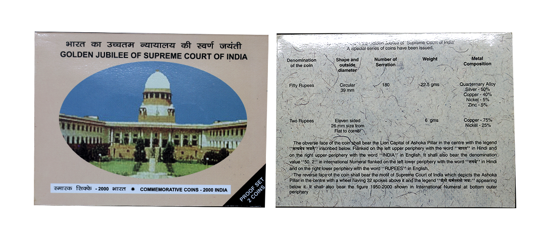 2000 Proof Set, Golden Jubilee of Supreme Court of India, set of 2, Rupees 2 and 50. In immaculate condition, within original packaging, Rare. (2); ( from the collection of Mr. I. K. Kejriwal ).