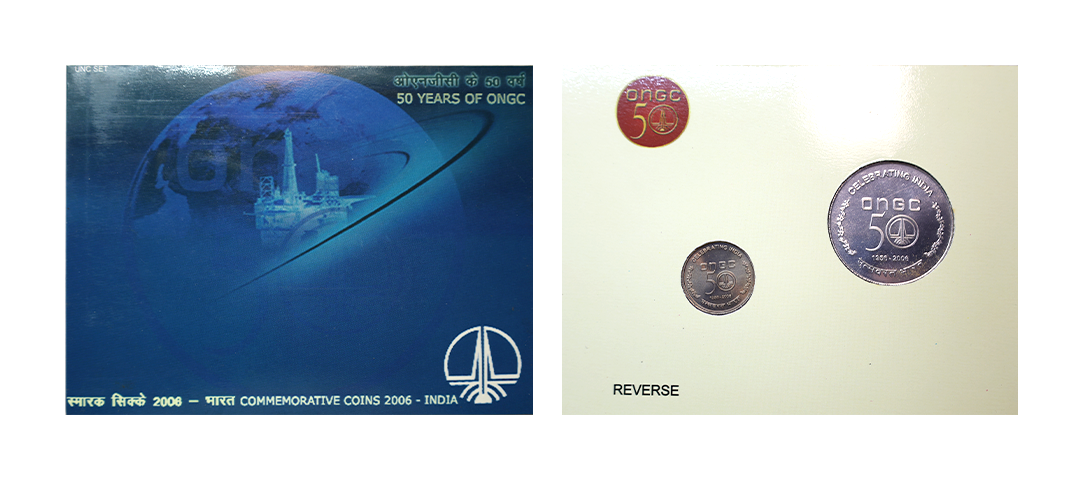 2006, 50 Years of ONGC, UNC set of 2 coins, 50 rupees and 5 rupees, Kolkata mint, RB 308, in original mint packing.