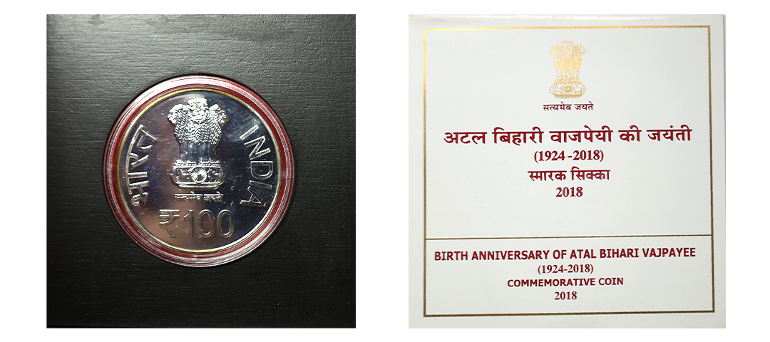 2018, Birth Anniversary of Atal Bihari Vajpayee, single UNC coin, 100 rupees, Mumbai mint, in original mint box packing.