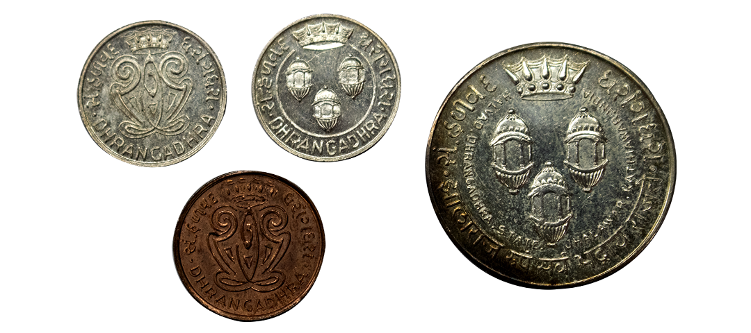 Dhrangadhra, Mayurdhvaja Sinha, Coronation series, ( Set of 4 coins ), 5.00g, 5.17g, 7.35g, 14.67g, Bronze (1), obv. bust of the ruler to left, with date VS 1998 below, rev. crest of the ruler surmounted by a crown; Silver (1) , obv. temple arch with a blessing mudra in center with legend in Devnagari ‘Sri Shakti Prasadan’; rev. crest of the ruler surmounted by a crown. In Mint State; Silver(2), obv. bust of the ruler to left, with date VS 1998 below, rev. three royal windows surmounted by a crown with legend Jhalaraj Rupam Sarva Bhadraya Rajate in Devanagari, and Halavad Dhrangdhara State Jhalawar Kathiawar. Extremely Fine, Scarce.(4).