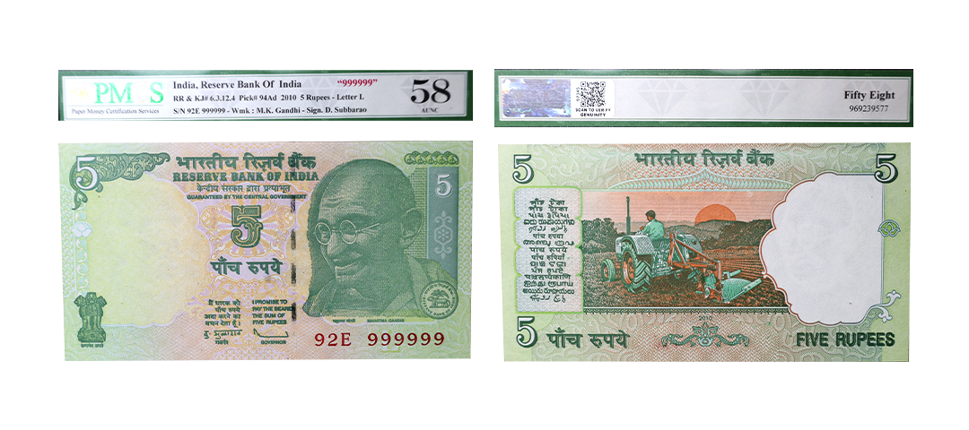 5 Rupees, 2010, Fancy Number, Signed by D. Subbarao, Inset L, Serial No. 92E 999999, Graded by PMCS 58 AUNC, Scarce.
