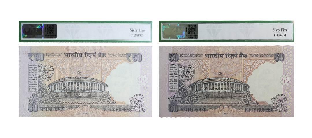 50 Rupees, 2011 & 2013, Set of 2 Notes, Old Gandhi Series, Fancy Number, Signed by D. Subbarao, Double 786, Inset I & L, Serial No: 8DB 786786 & 7ER 786786, PMCS graded 65 Gem Uncirculated.