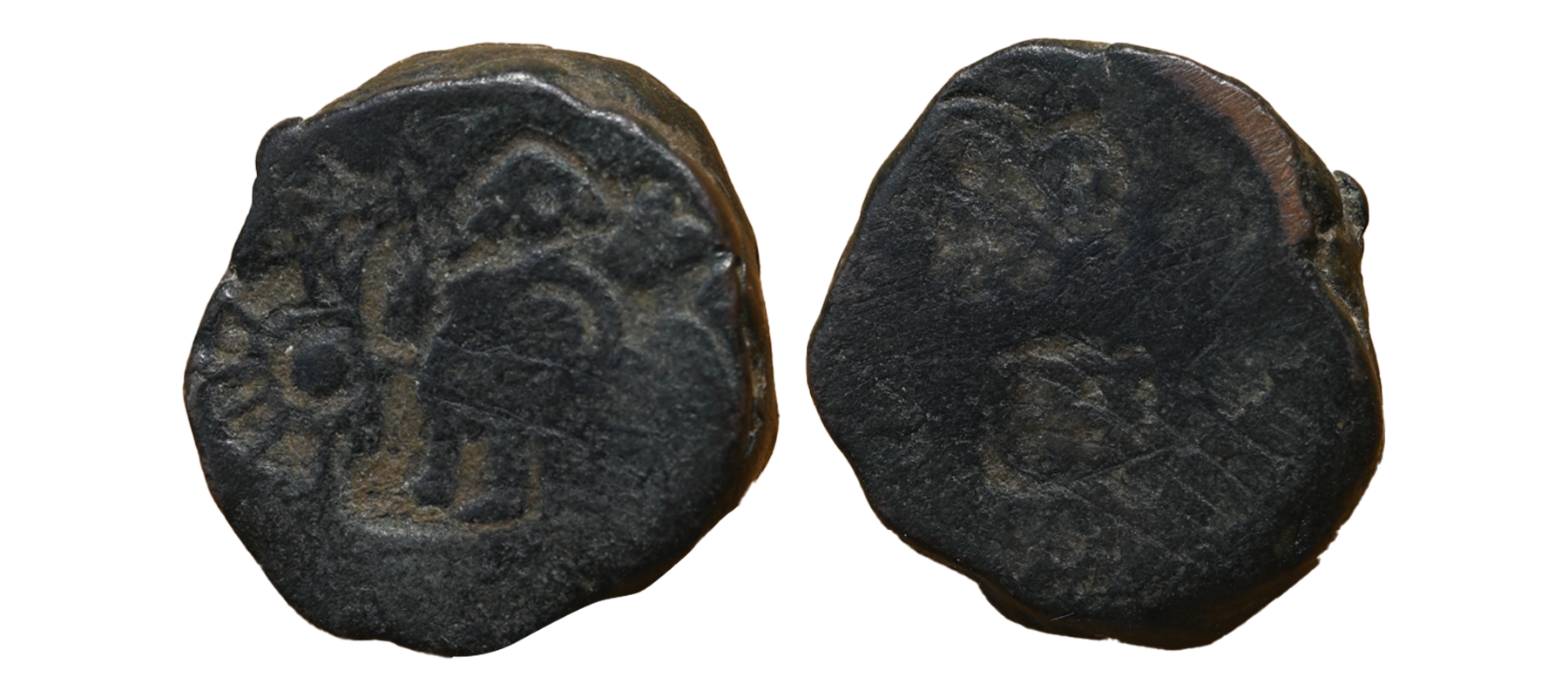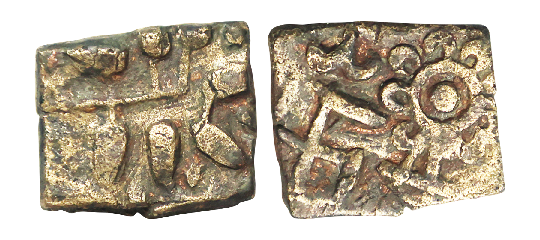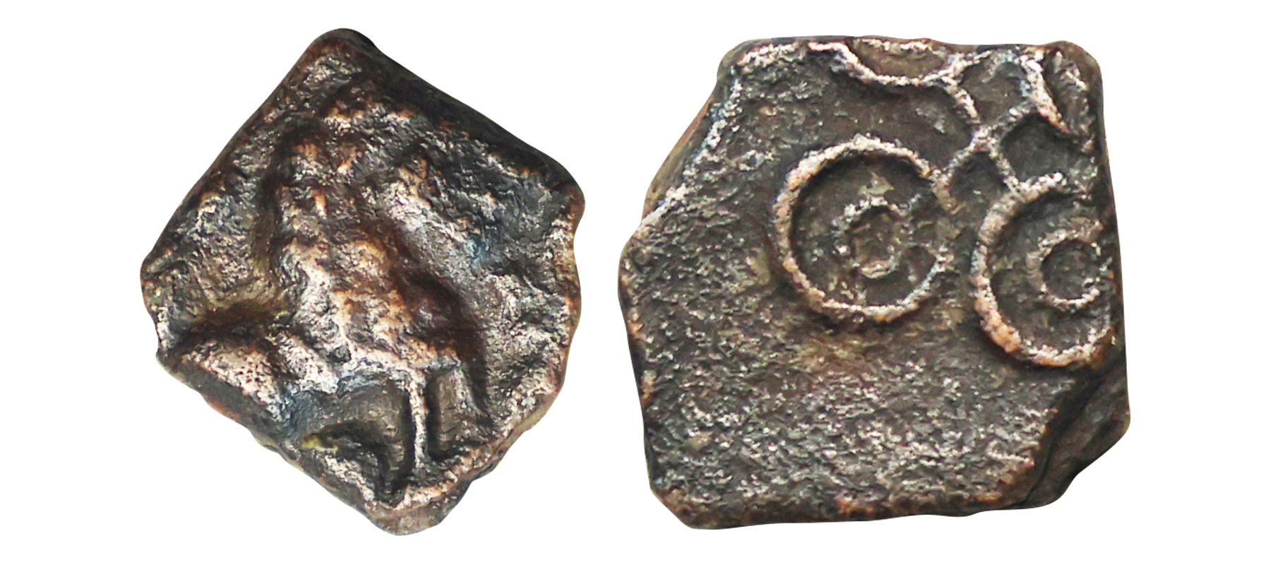 Ujjain, (2nd – 1st Century BC), Uninscribed Type, Copper Unit, 2.14 gms, Obv. Elephant to right facing indradhvaja ujjaini symbol & chakra above, Rev. Ujjaini symbol, exact type unlisted, similar to Pieper #748, very fine, very scarce.