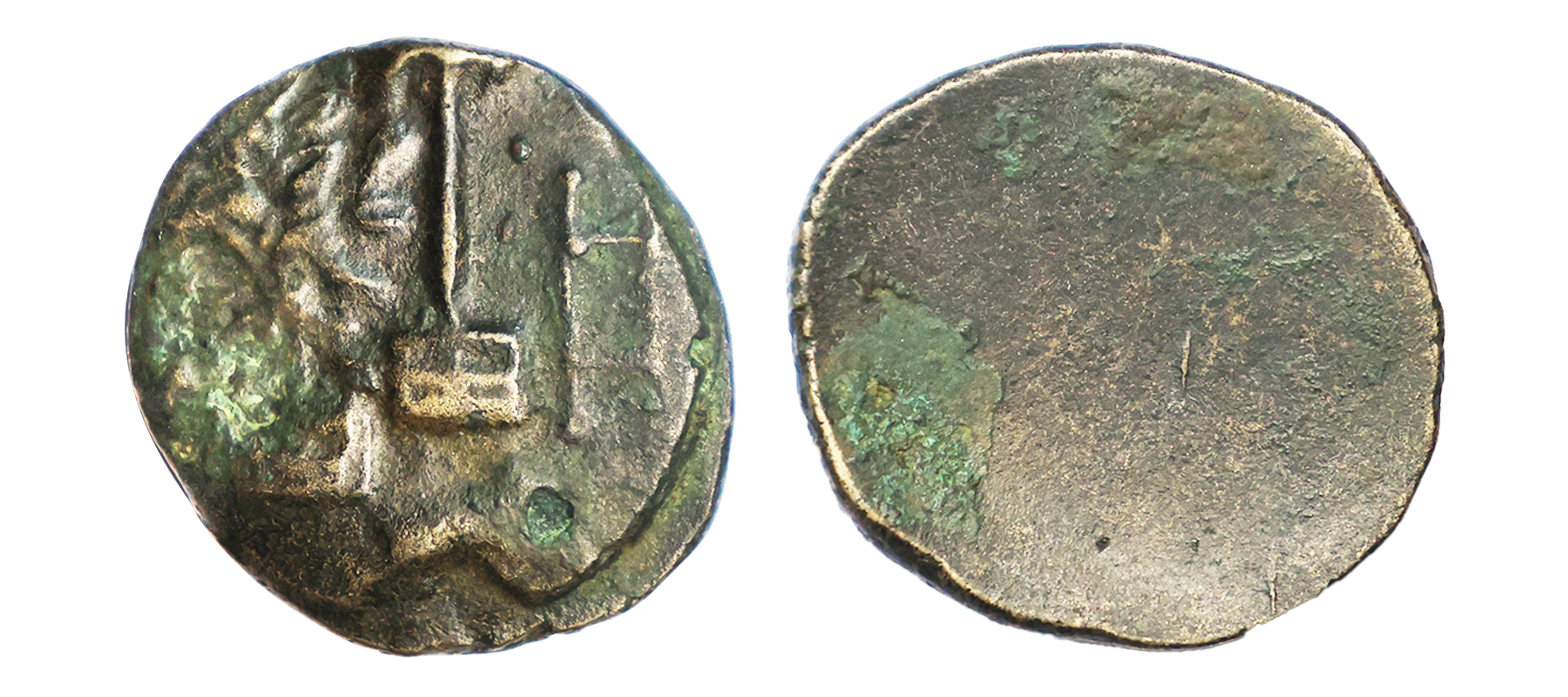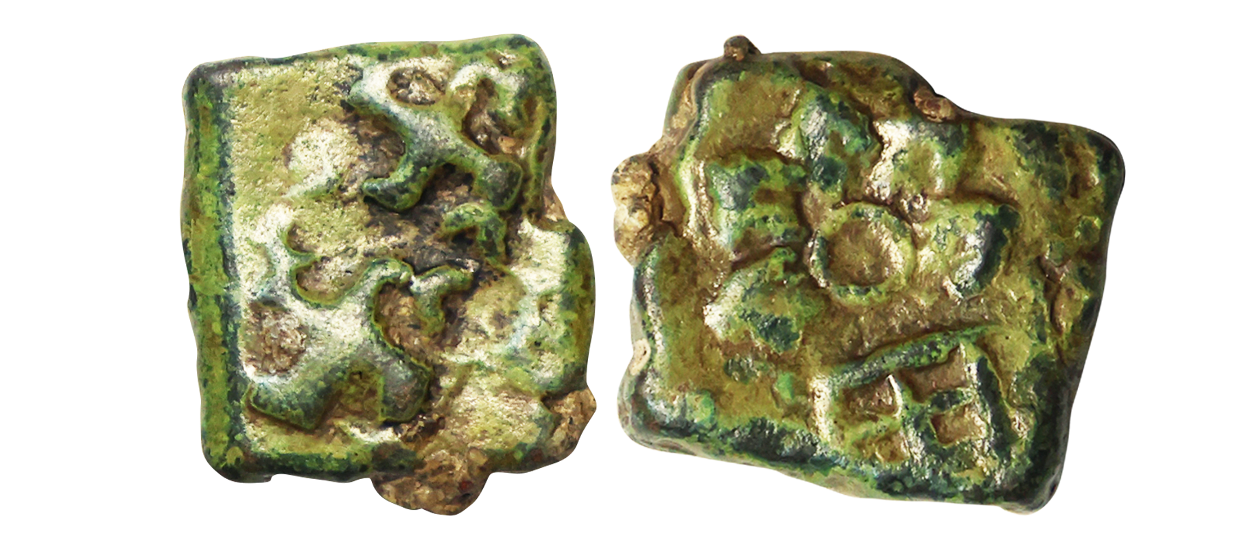 Ujjain (2nd-1st Century BC), Copper Punch Mark, 6.67 gms, Mahakal Type, Obverse: punch of Standing deity Mahakaal, taurnine above chakra on left field, Reverse: traces of Ujjain & three orbed symbol, very fine, very scarce.