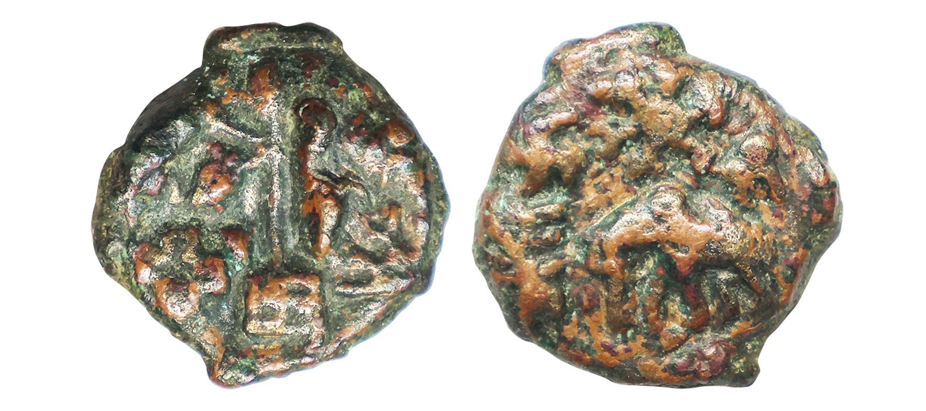 Bhon Region of Vidarbha, Post Mauryan, (2nd-1st Century BC), Copper Unit, 1.58 gms, Obv. Motifs of Flower, Triangle Standard (Indra Dhwaja), Shrivatsa and Swastika, Rev. Tree in railing with seven branches interspersed by dots, Pieper #2388, very fine+, very scarce.