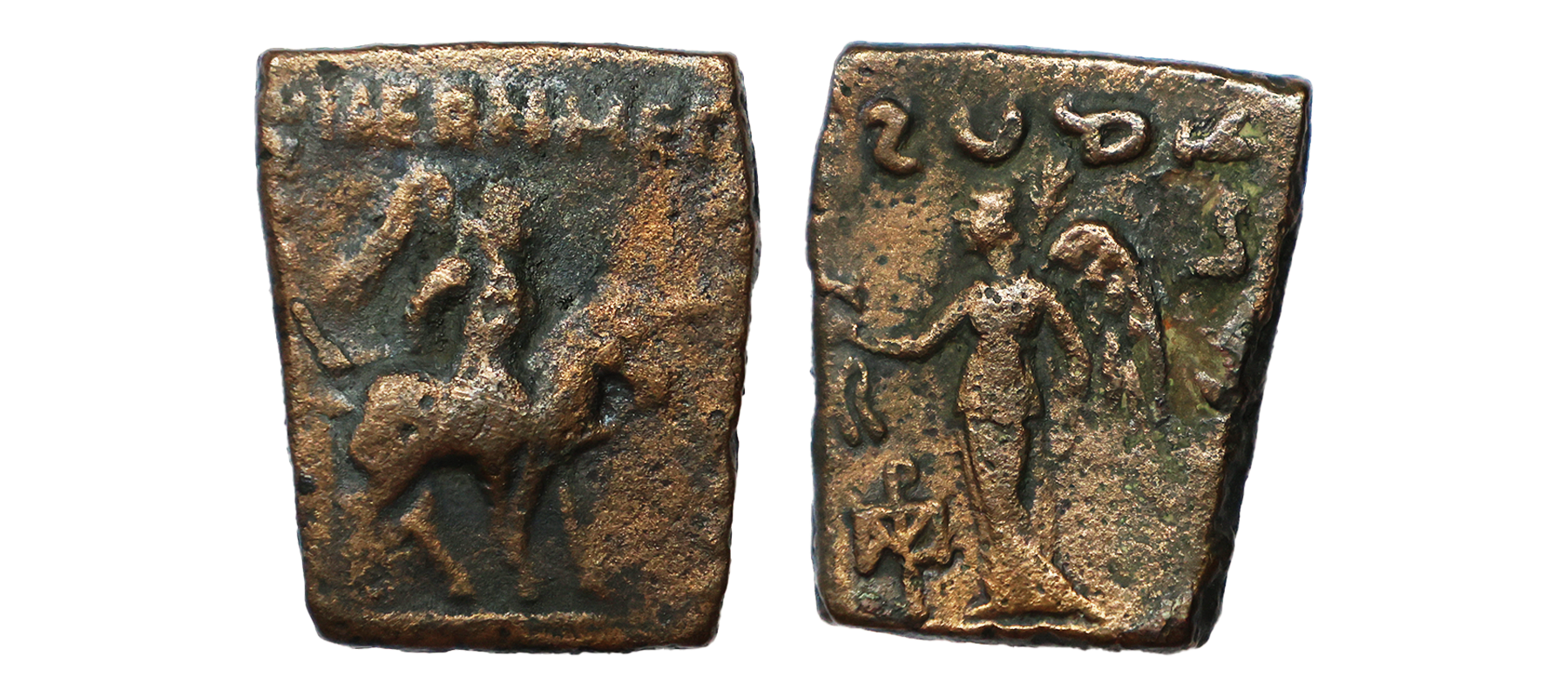 Indo-Greek, Menander I (155-130 BC), Square Obol, 21.11 gms, Obv. Facing bull's head & greek legends around ‘ΒΑΣΙΛΕΩΣ ΣΩΤΗΡΟΣ ΜΕΝΑΝΔΡΟΥ’, Rev. Tripod with Kharosthi legends ‘Maharajasa tratarasa menamdrasa’ around, Bop-29A, extremely fine for the type, very rare.