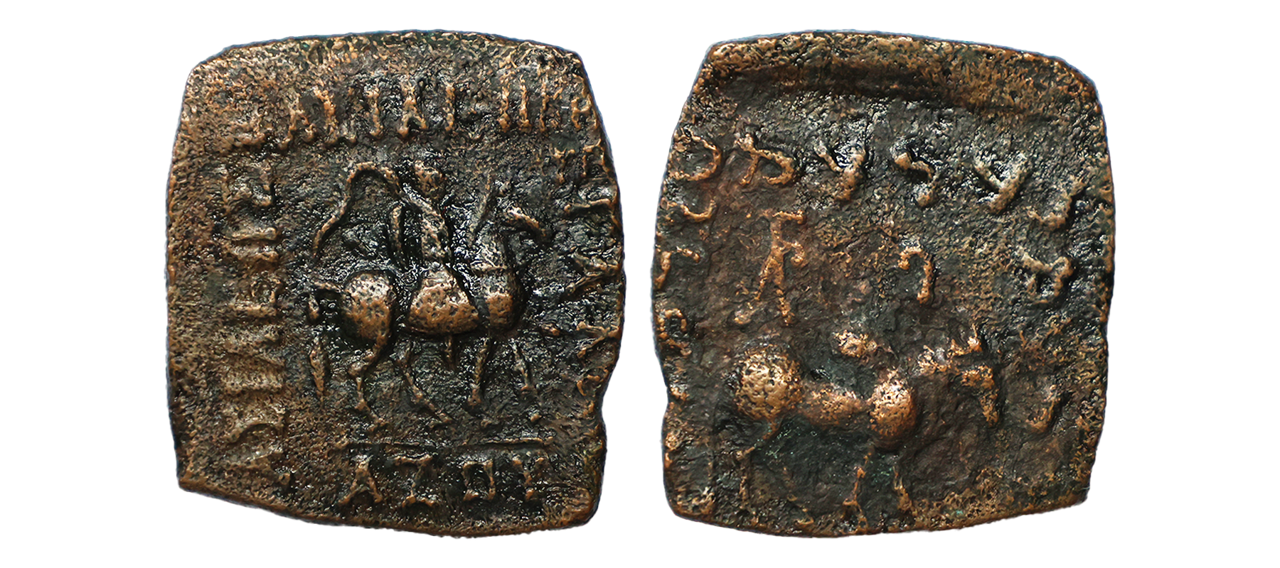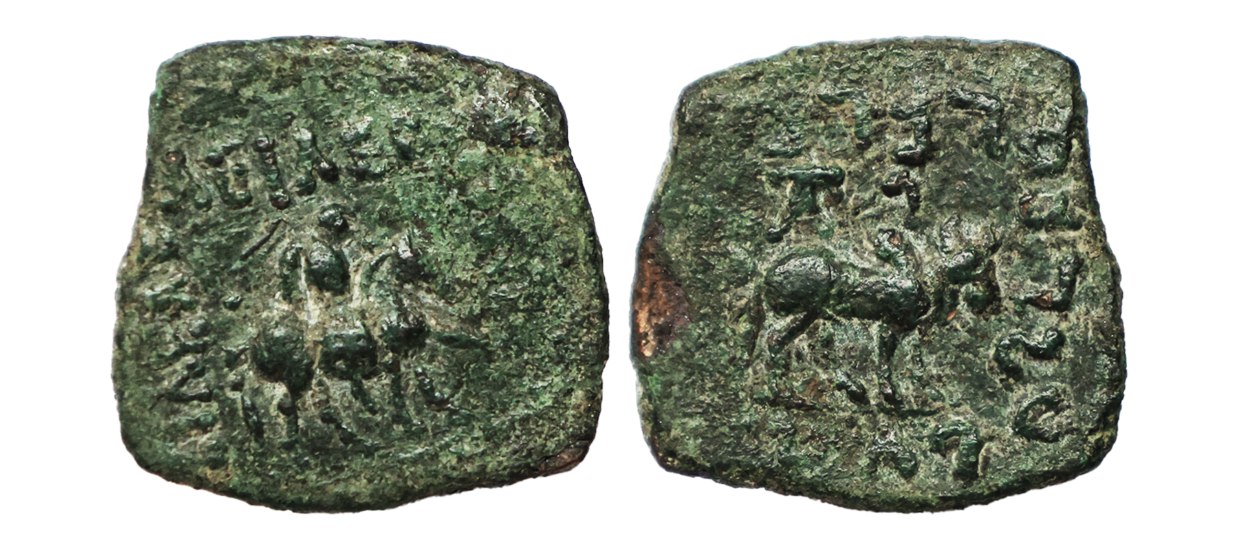 Indo Scythian, Vonones with Spalahores (75-65 BC), Copper Unit, 8.12 gms, Obv. Herakles standing facing, placing his right hand on his head and holding club and lion skin in his left with Greek legends ‘BAΣIΛЄΩΣ BAΣIΛЄΩΝ MEΓΑΛΟΥ ONΩNOY’ around, Rev. athena standing left, holding spear and shield & monogram to left, 'Maharahabhrata dhramikasa Spalahorasa' in Kharosthi seen partially, (of the Great King's Brother, Spalahores the Just), Senior #66.3, about very fine, very rare.