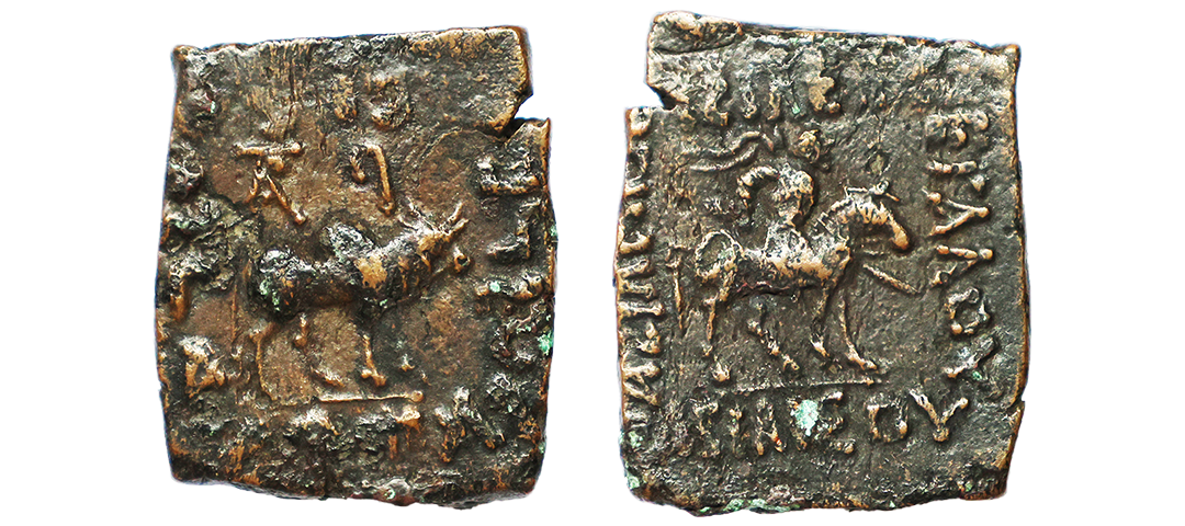 Indo Scythians, Azes (58-12 BC), Copper Hexachalkon, 13.03 gms, Obv. Bull to right monogram above, Greek legends ‘BAΣIΛEΩΣ BAΣIΛEΩN MEΓAΛOY / AZOY’ around, Rev. lion to left monogram above, Kharosthi legends ‘Maharajasa rajadhirajasa mahatasa / Ayasa’ around, Senior #102.133, fine+, scarce.
