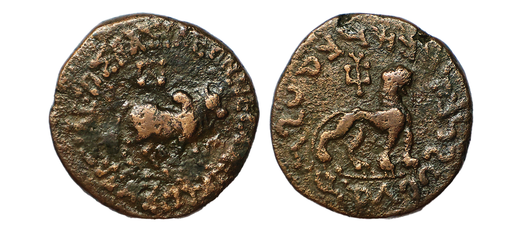 Indo Scythians, Azes (58-12 BC), Copper Hexachalkon, 13.03 gms, Obv. Bull to right monogram above, Greek legends ‘BAΣIΛEΩΣ BAΣIΛEΩN MEΓAΛOY / AZOY’ around, Rev. lion to left monogram above, Kharosthi legends ‘Maharajasa rajadhirajasa mahatasa / Ayasa’ around, Senior #102.133, fine+, scarce.