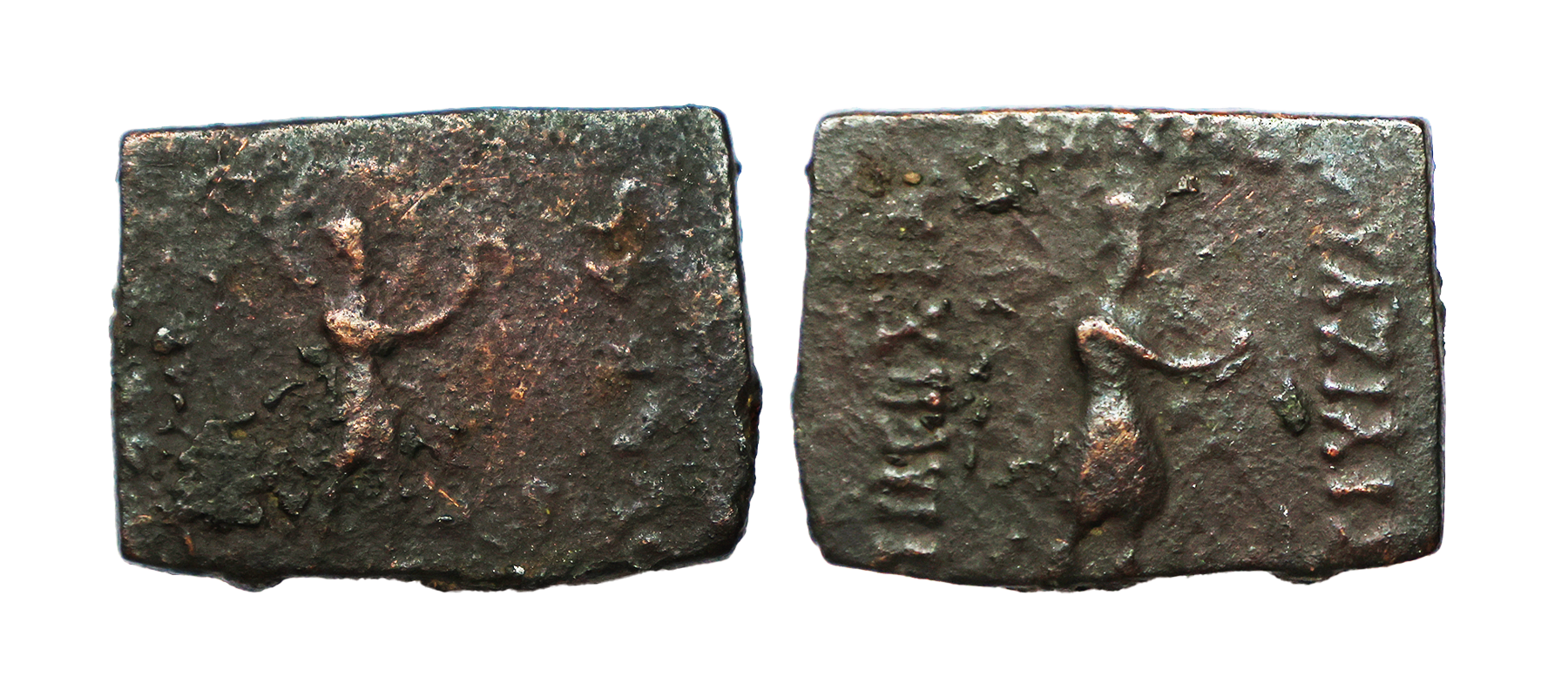 Indo Scythians, Azilises (5-45/35 BC). Copper Unit, 9.65 gms, Obv. King standing right, holding spear and shield, Rev. Female deity standing right & monogram on right field, holding wreath, Senior #38.1, fine, very rare.
