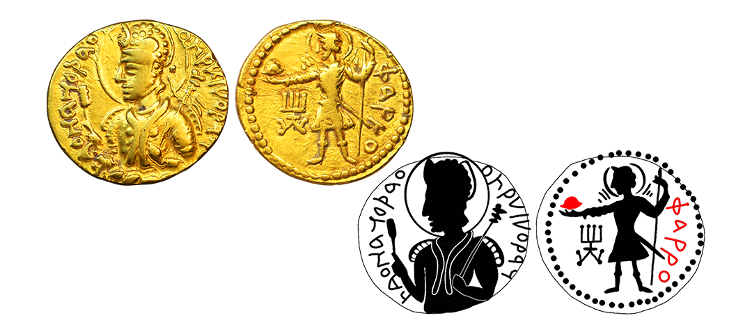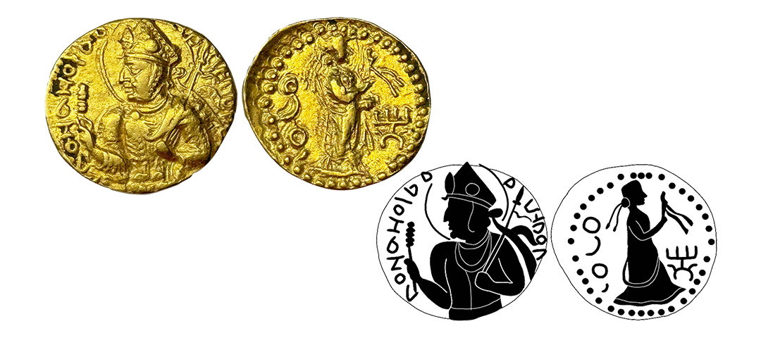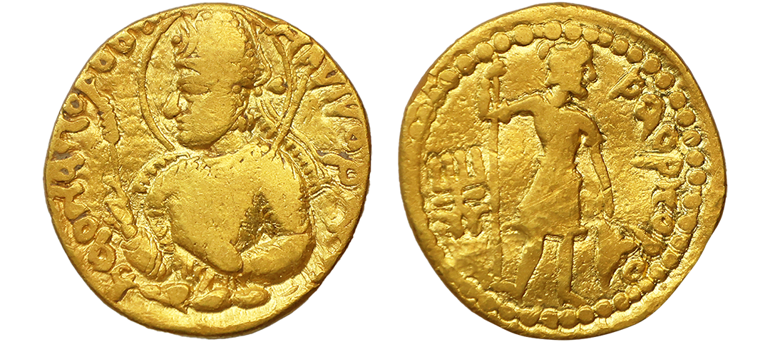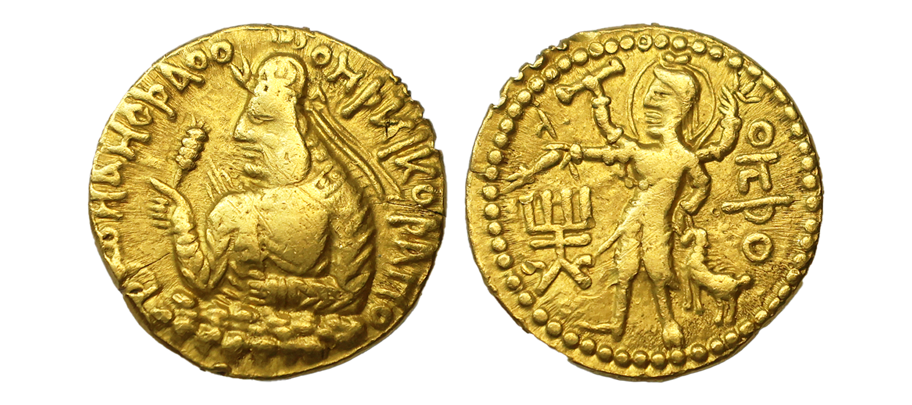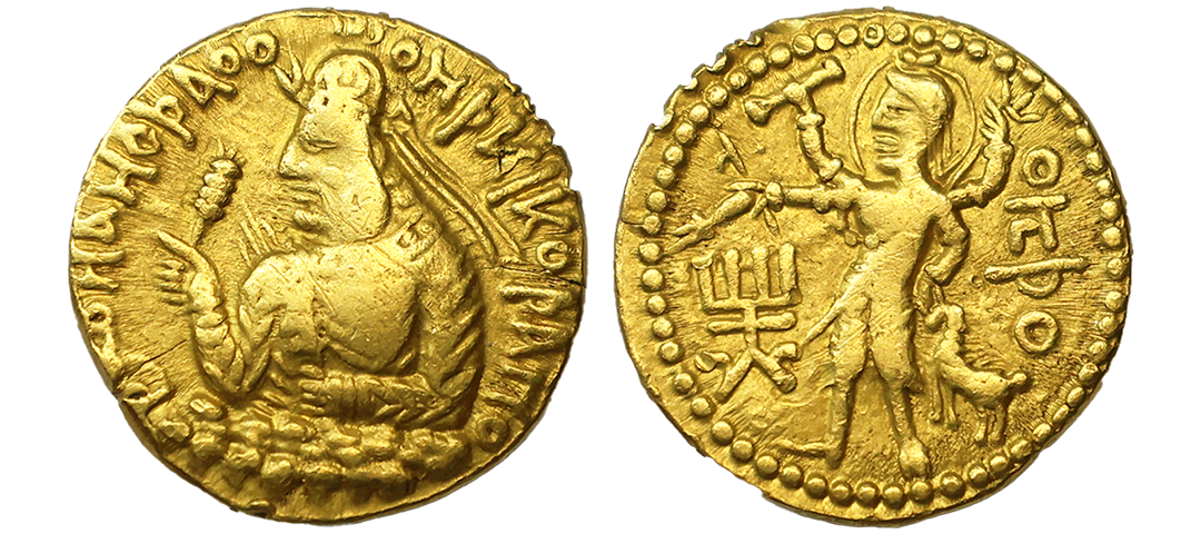 Kushanas, Huvishka (155-190 AD), Gold Dinar, 7.80 gms, ‘Oesho’ *(four armed) Type, Obv. diademed and half-length crowned bust facing the left, emerging from clouds, holding a mace-scepter in one hand and an elephant-goad (ankush) in the other hand, Bactrian legends ‘þAONANOþAO OOηþKI KOþANO’ (King of Kings Huvishka the Kushan) around the field, Rev. four-armed Oesho (Shiva) standing, nimbate, facing left, hair in a top knot and wearing a dhoti, holding a tilted water pot in his lower-right hand, a damru in upper-right hand, and a trident in his upper-left hand, an antilope is held by the horns in his lower-left hand, tamgha on the left field, Bactrian legend ‘OηþO’ (OESHO) on the right field, dotted border around the field, completely struck on both sides, extremely fine with high relief, minor dent/gold testing marks on edge, very rare. Note: Huvishka’s Oesho type dinar are comparatively very rare than Kanishka’s Oesho type dinar.
