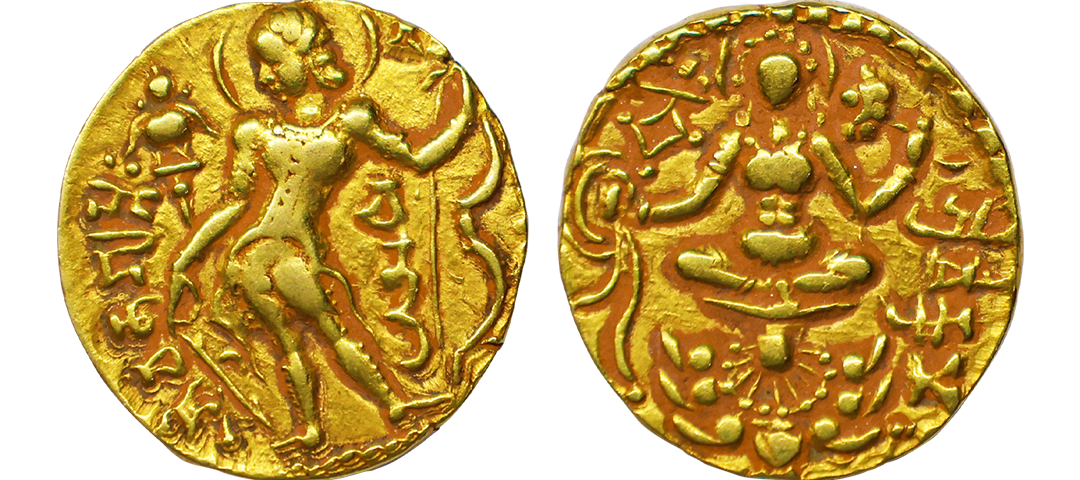 Gupta Empire, Chandragupta II (375-415 AD), Gold Dinar, 7.80 gms, Archer type, Complete Legend SHRICHANDRAGUPTAH on obverse amd a centrall struck reverse, Obv. King standing with right arm outstretched holding an arrow, Left arm is holding a bow, Garuda standard behind right arm, Brahmi legend ‘ShriChaNdraGuPtah’ on the lower left field & ‘ChaNdra’ below left arm, Rev. Goddess Lakshmi seated facing on a lotus, Holding a diadem in right arm and a lotus stalk in left arm flexed up, Brahmi legend ‘Shri ViKraMah‘ in right field, partial dotted border around, TOTGE A.3.4, very fine, very rare in grade.