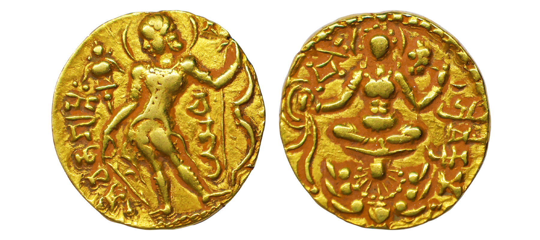 Gupta Empire, Chandragupta II (375-415 AD), Gold Dinar, 7.80 gms, Archer type, Complete Legend SHRICHANDRAGUPTAH on obverse amd a centrall struck reverse, Obv. King standing with right arm outstretched holding an arrow, Left arm is holding a bow, Garuda standard behind right arm, Brahmi legend ‘ShriChaNdraGuPtah’ on the lower left field & ‘ChaNdra’ below left arm, Rev. Goddess Lakshmi seated facing on a lotus, Holding a diadem in right arm and a lotus stalk in left arm flexed up, Brahmi legend ‘Shri ViKraMah‘ in right field, partial dotted border around, TOTGE A.3.4, very fine, very rare in grade.