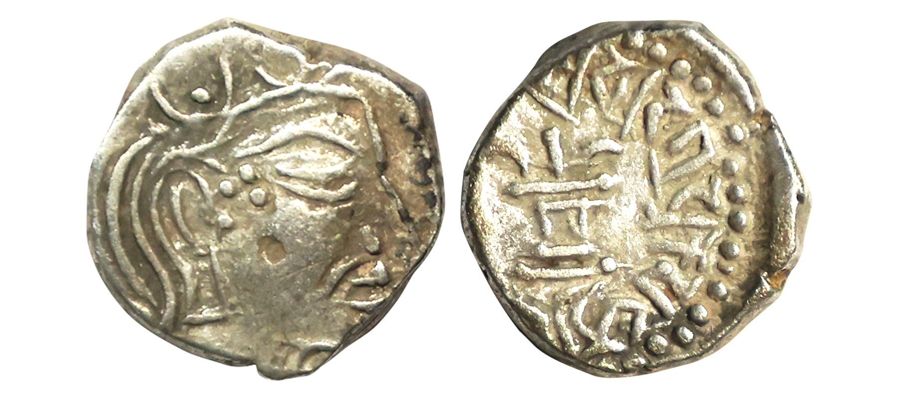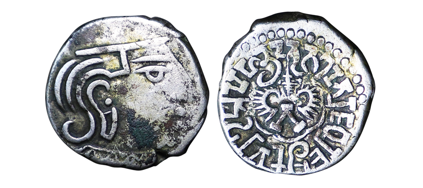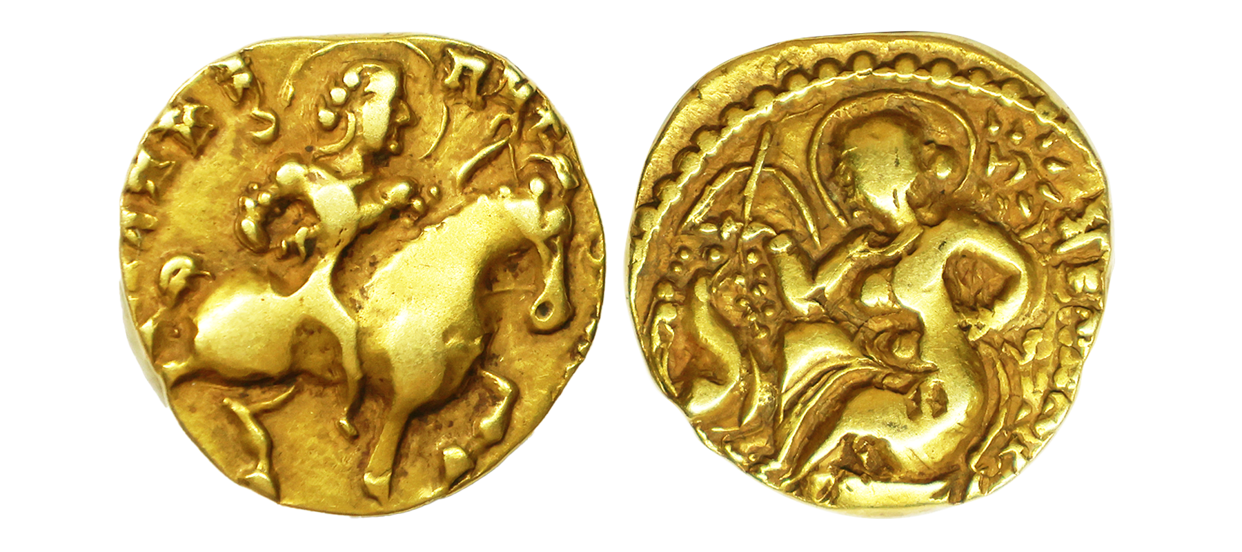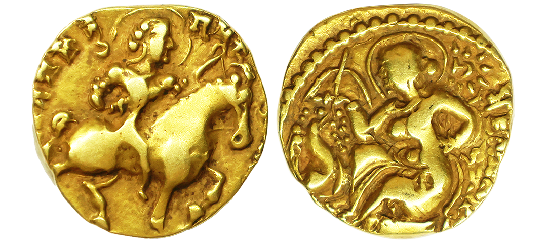 Gupta Empire, Kumaragupta I (415-455 AD), Gold Dinar, 8.07 gms, Horseman to Right type, Obv: king riding a horse to the right, wearing armlets, Brahmi legend ‘GupToKu(la vyomasasi jyatyajeyo) jitamahendrah’ around the field, Rev. goddess Lakshmi, neck, wrists bejewelled, seated facing left on a wicker stool, left hand of the goddess rests on her waist, holding a lotus with a long stalk, feeding grapes to a peacock on the left field, partial Brahmi legend "AJiTaMaHenDrah" on the right, dotted border around, TOTGE Class III- Variety A, extremely fine, very rare.