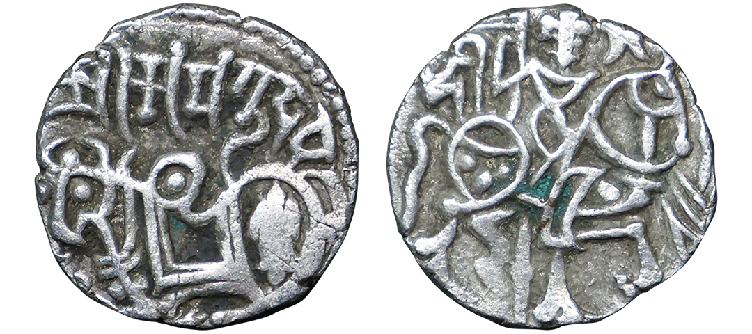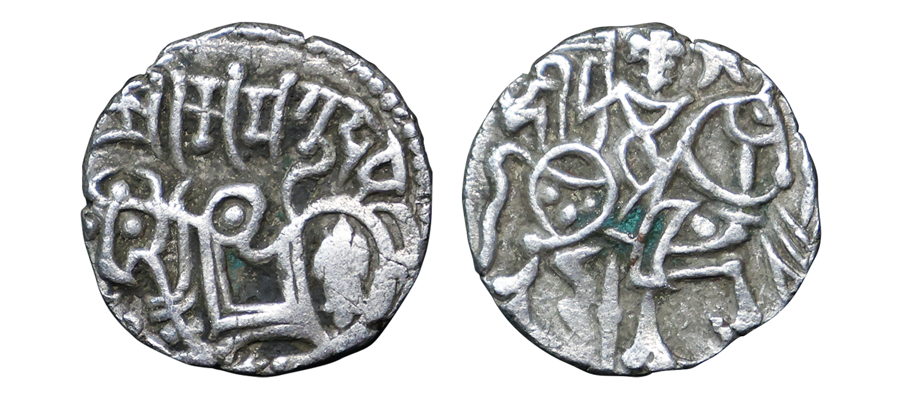 Hindu Medieval, Hindu Shahi rulers of Oahind dynasty, Shri Samantadeva (8th-10th Century AD), Set f 2, Silver Unit, 3.21 gms & 3.19 gms, Obv. Horseman to right with spear in hand, Sharada letter ‘Bhi‘ at 10 O clock position, Rev. Seated decorated bull to left, Legend on its back reading in Sharada script as ‘Shri Samantadeva’, very fine, scarce.