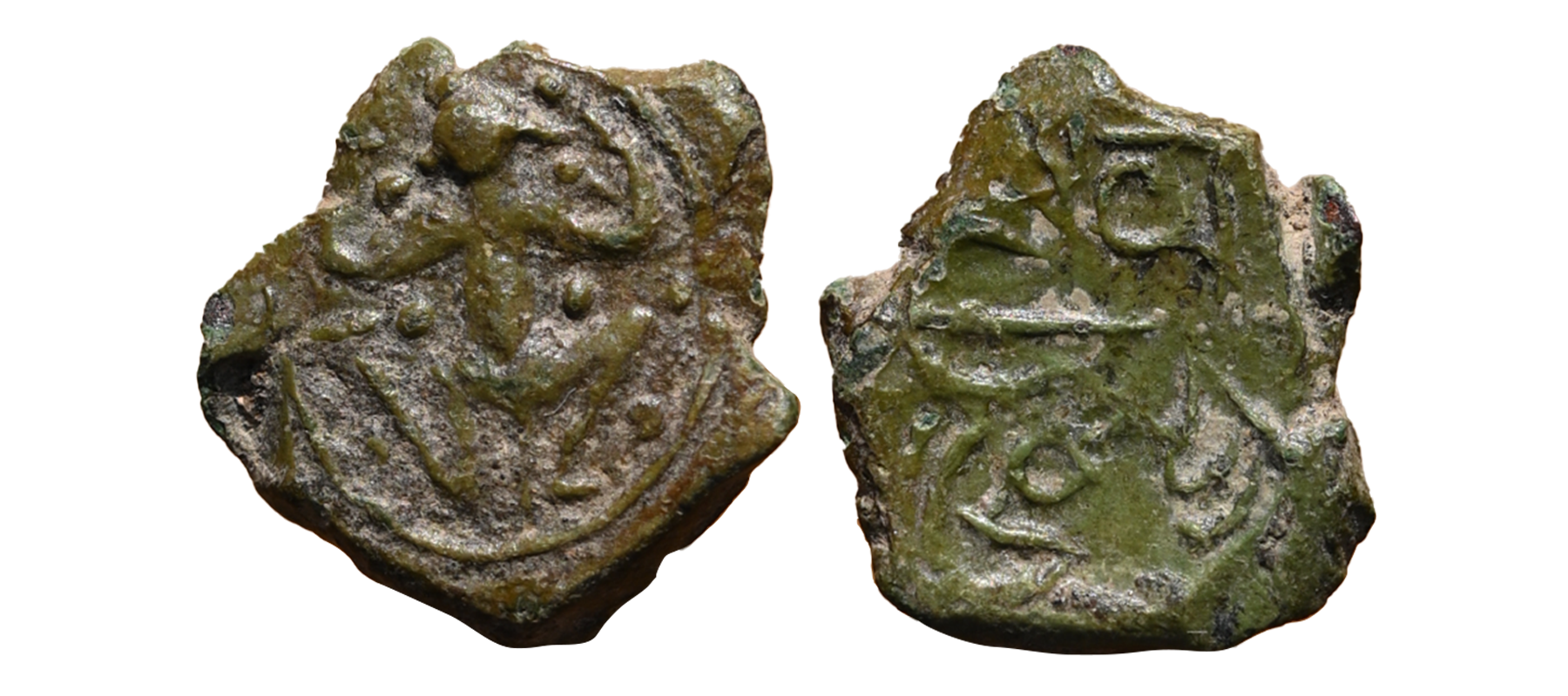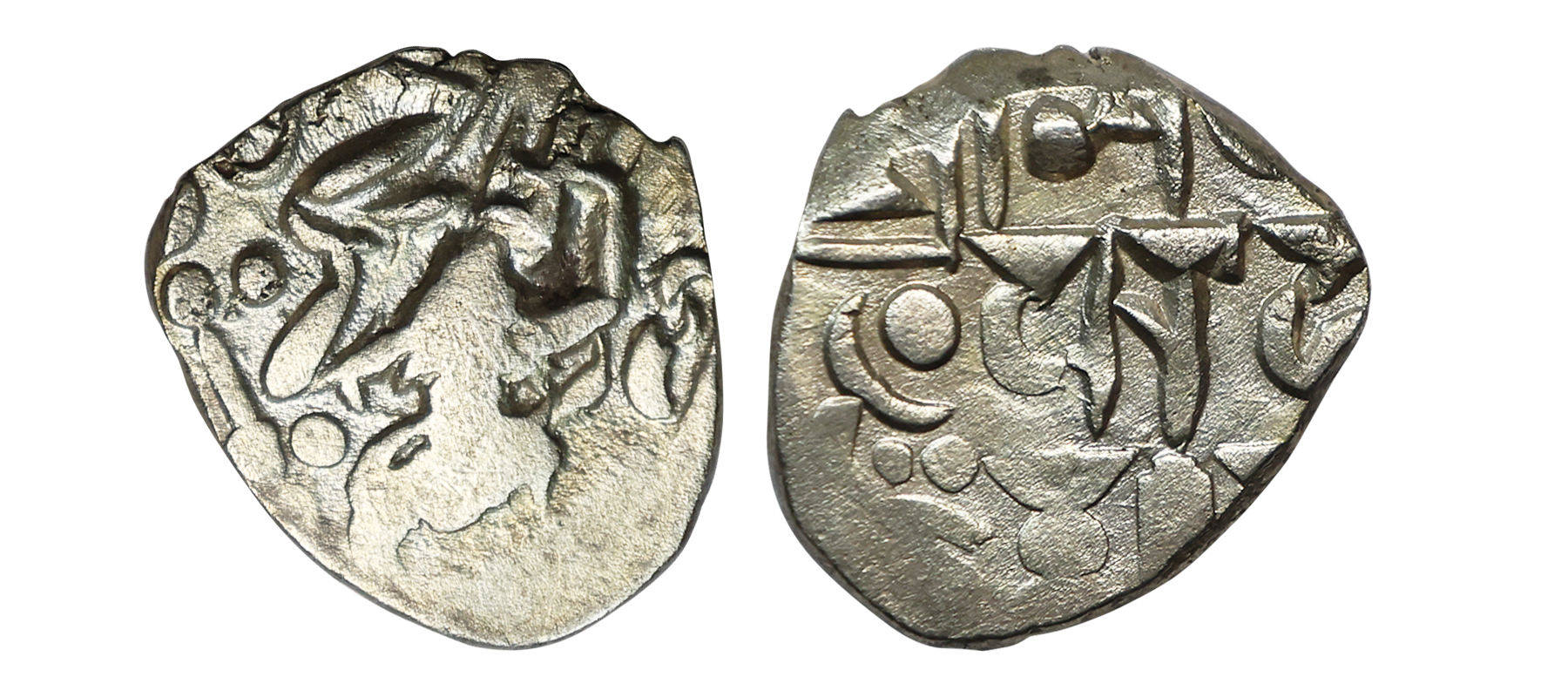 Loharas of Kashmir, Harshadeva (10-11 Century CE), Silver Dinar, 3.05 gms, Obv. Man seated on horseback facing right, wearing an angular headdress and holding a spear, Sarada legend ‘Sri Harshadeva’ above, Rev. goddess seated facing forward, holding a lotus and a vase, JONS-208 (2011) # pp.28-33, very fine+, extremely rare.