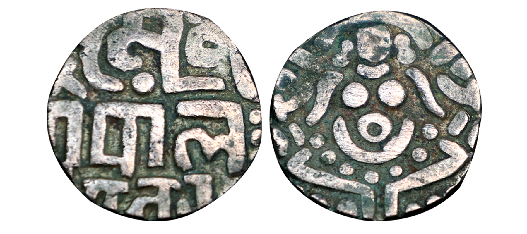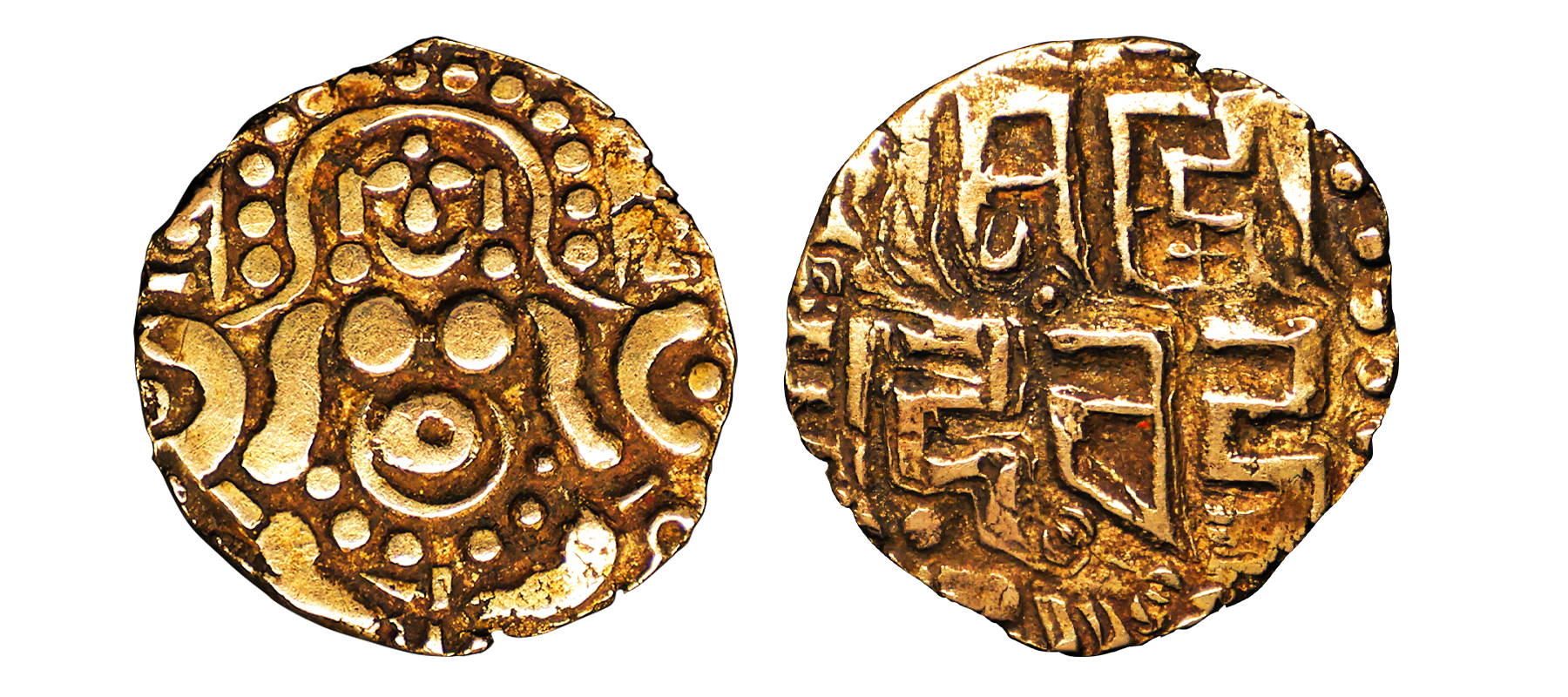 Kakatiyas of Warangal, Prola-II (1110-1158 CE), Gold PMC, 2 ½ Gold Gadyana, 9.77 gms, ‘Goddess Lakshmi’ type, Total of 16 repousse punches elegantly hammered on the obverse of a Padma shaped circular flan. The central punch consists of the image of Goddess Lakshmi seated in Padmasana within an arched Garbhagriha, the sanctum sanctorum. She holds two lotus flowers in her upper hands which are the symbols of beauty, prosperity and fertility. The lower 2 hands are in the abhaya mudra of divine protection and the varada mudra of granting boon. The peripheral circumfluent punches consist of 2x Sri-Sri, 1x 'Mandalika' and 1x 'Kesari' all inscribed in Kannada, and 4 groups of Lotus-Boar-Lotus symbol punches interleaving the legend punches. The boar is shown walking facing right. Almost Uncirculated, extremely rare.