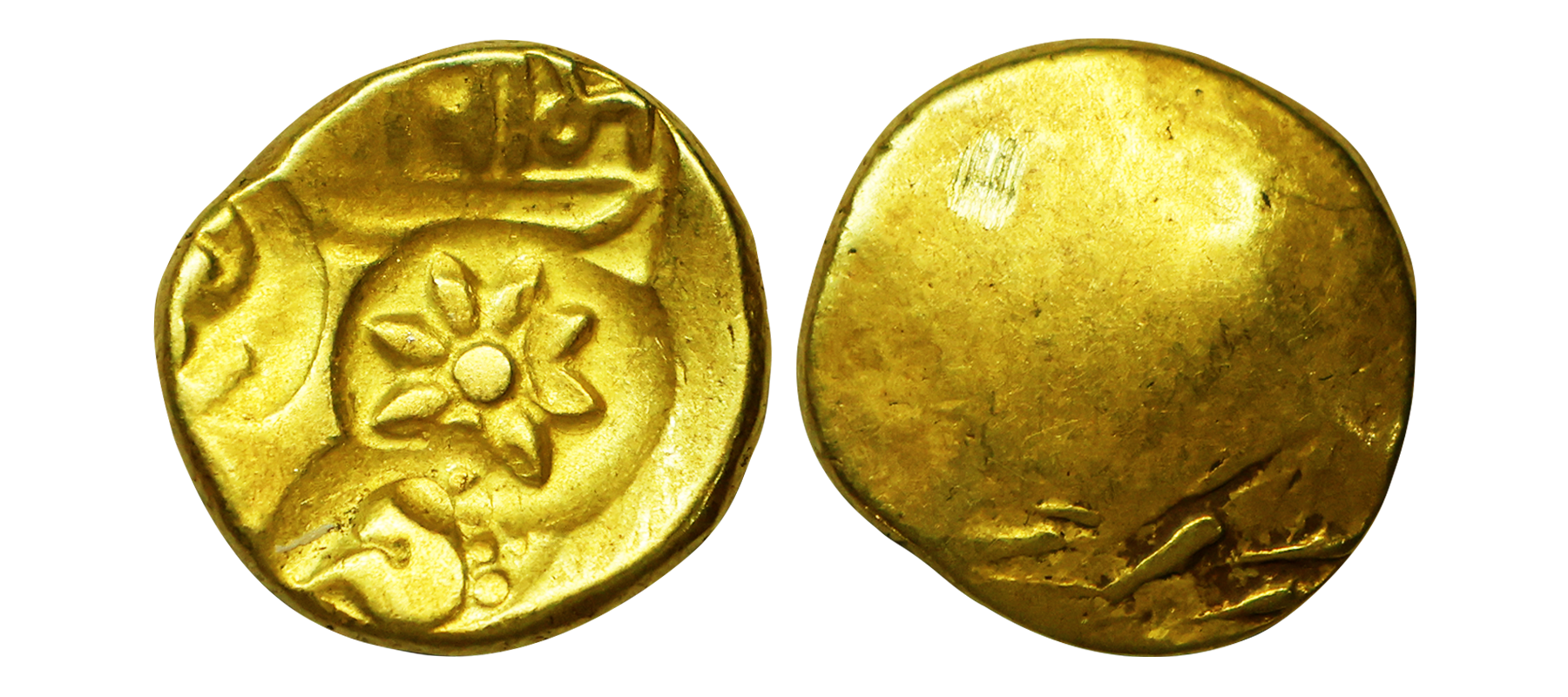 Yadavas of Devagiri, Ramachandradeva (1271-1311 AD), Gold Padmatanka, 3.79 gms, Obv. Five punches: 2 x Kannada letter 'Shri', 1 x Sankha (Conch), 1 x Lotus at centre and 1 x Nagari legend ‘ShriRaMa’ with a javelin below, Reference # K. Ganesh, Karnataka Coins, 7.19, extremely fine, rare.